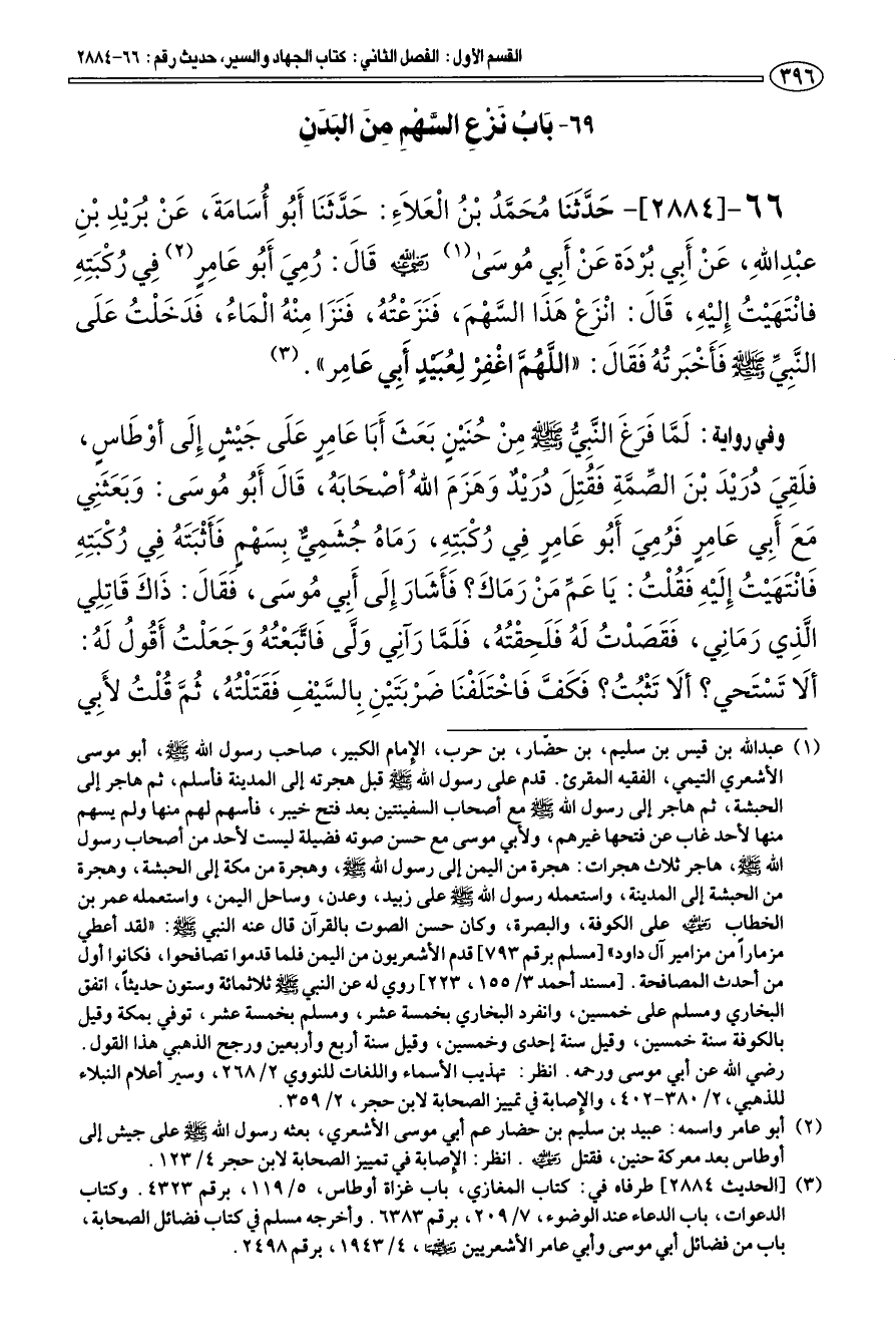66 - [2884] حَدَّثَنَا محَمَّد بْن الْعَلاَءِ: حَدَّثَنَا أَبو أسَامَةَ، عَنْ بريْدِ بْنِ عبد الله، عَنْ أَبِي برْدَة عَنْ أَبِي موسَى (¬1) رضي الله عنه قَالَ: «رمِيَ أَبو عَامِرٍ (¬2) فِي ركْبَتِهِ فانْتَهَيْت إِليْهِ، قَالَ: انْزَعْ هَذَا السَّهْمَ، فَنَزَعْته، فَنَزَا مِنْه الْمَاء، فَدَخَلْت عَلَى النَّبِيِّ صلى الله عليه وسلم فأَخْبَرته فَقَالَ: " اللَّهمَّ اغْفِرْ لِعبيدٍ أَبِي عَامِر» (¬3).