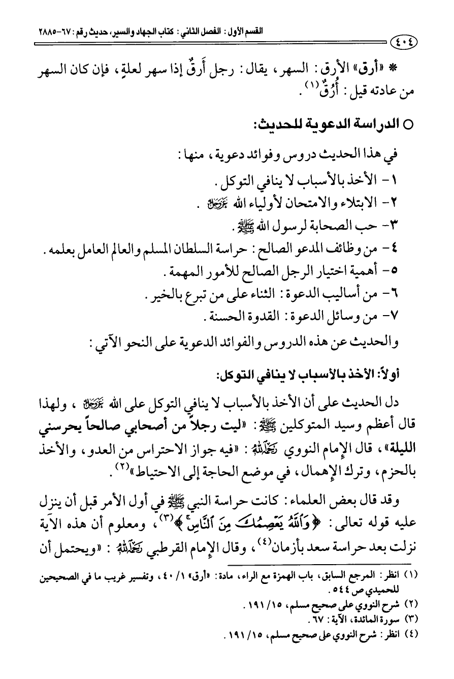 أولا: الأخذ بالأسباب لا ينافي التوكل: دل الحديث على أن الأخذ بالأسباب لا ينافي التوكل على الله عز وجل، ولهذا قال أعظم وسيد المتوكلين صلى الله عليه وسلم: «ليت رجلا من أصحابي صالحا يحرسني الليلة»، قال الإِمام النووي رحمه الله: " فيه جواز الاحتراس من العدو، والأخذ بالحزم، وترك الإِهمال، في موضع الحاجة إلى الاحتياط " (¬2). وقد قال بعض العلماء: كانت حراسة النبي صلى الله عليه وسلم في أول الأمر قبل أن ينزل عليه قوله تعالى: {وَاللَّهُ يَعْصِمُكَ مِنَ النَّاسِ} [المائدة: 67] (¬3) ومعلوم أن هذه الآية نزلت بعد حراسة سعد بأزمان (¬4) وقال الإِمام القرطبي رحمه الله: " ويحتمل أن