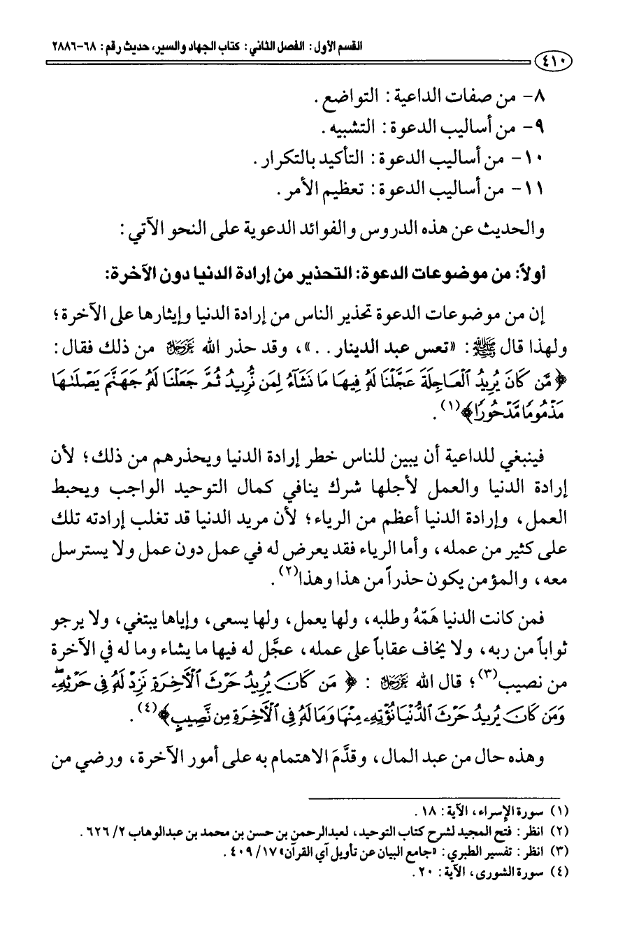 أولا: من موضوعات الدعوة: التحذير من إرادة الدنيا دون الآخرة: إن من موضوعات الدعوة تحذير الناس من إرادة الدنيا وإيثارها على الآخرة؛ ولهذا قال صلى الله عليه وسلم: «تعس عبد الدينار». . "، وقد حذر الله عز وجل من ذلك فقال: {مَنْ كَانَ يُرِيدُ الْعَاجِلَةَ عَجَّلْنَا لَهُ فِيهَا مَا نَشَاءُ لِمَنْ نُرِيدُ ثُمَّ جَعَلْنَا لَهُ جَهَنَّمَ يَصْلَاهَا مَذْمُومًا مَدْحُورًا} [الإسراء: 18] (¬1).