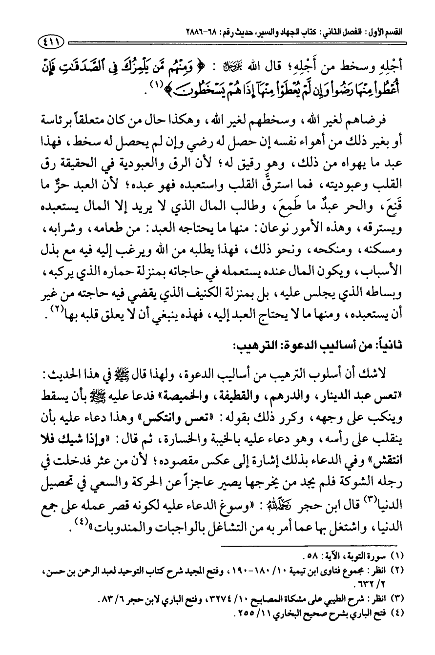 ثانيا: من أساليب الدعوة: الترهيب: لا شك أن أسلوب الترهيب من أساليب الدعوة، ولهذا قال صلى الله عليه وسلم في هذا الحديث: «تعس عبد الدينار، والدرهم، والقطيفة، والخميصة» فدعا عليه صلى الله عليه وسلم بأن يسقط وينكب على وجهه، وكرر ذلك بقوله: «تعس وانتكس» وهذا دعاء عليه بأن ينقلب على رأسه، وهو دعاء عليه بالخيبة والخسارة، ثم قال: «وإذا شيك فلا انتقش» وفي الدعاء بذلك إشارة إلى عكس مقصوده؛ لأن من عثر فدخلت في رجله الشوكة فلم يجد من يخرجها يصير عاجزا عن الحركة والسعي في تحصيل الدنيا (¬3) قال ابن حجر رحمه الله: " وسوغ الدعاء عليه لكونه قصر عمله على جمع الدنيا، واشتغل بها عما أمر به من التشاغل بالواجبات والمندوبات " (¬4).