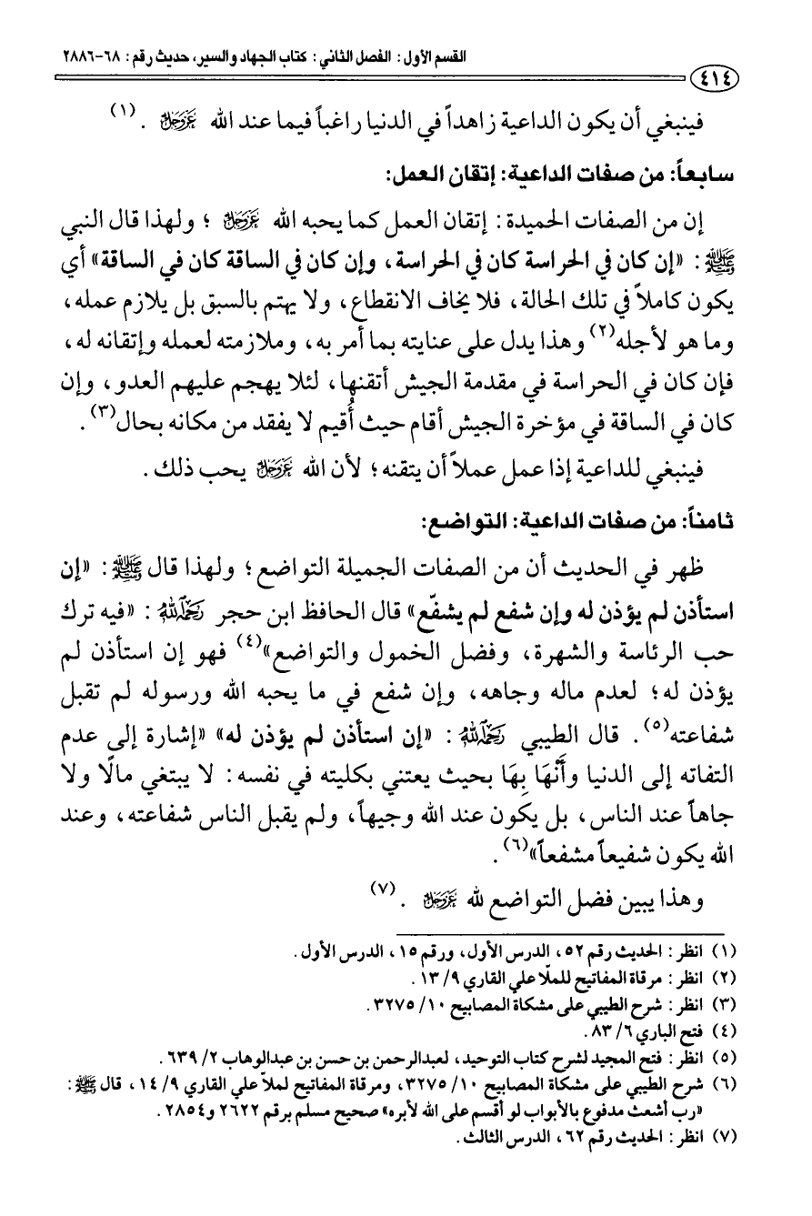 سابعا: من صفات الداعية: إتقان العمل: إن من الصفات الحميدة: إتقان العمل كما يحبه الله عز وجل؛ ولهذا قال النبي صلى الله عليه وسلم: «إن كان في الحراسة كان في الحراسة، وإن كان في الساقة كان في الساقة» أي يكون كاملا في تلك الحالة، فلا يخاف الانقطاع، ولا يهتم بالسبق بل يلازم عمله، وما هو لأجله (¬2) وهذا يدل على عنايته بما أمر به، وملازمته لعمله وإتقانه له، فإن كان في الحراسة في مقدمة الجيش أتقنها لئلا يهجم عليهم العدو، وإن كان في الساقة في مؤخرة الجيش أقام حيث أقيم لا يفقد من مكانه بحال (¬3).