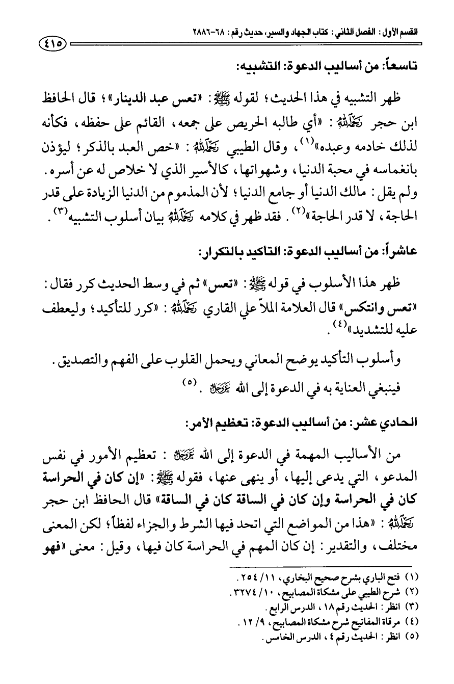 تاسعا: من أساليب الدعوة: التشبيه: ظهر التشبيه في هذا الحديث؛ لقوله صلى الله عليه وسلم: «تعس عبد الدينار»؛ قال الحافظ ابن حجر رحمه الله: " أي طالبه الحريص على جمعه، القائم على حفظه، فكأنه لذلك خادمه وعبده " (¬1) وقال الطيبي رحمه الله: " خص العبد بالذكر؛ ليؤذن بانغماسه في محبة الدنيا، وشهواتها، كالأسير الذي لا خلاص له عن أسره. ولم يقل: مالك الدنيا أو جامع الدنيا؛ لأن المذموم من الدنيا الزيادة على قدر الحاجة، لا قدر الحاجة " (¬2). فقد ظهر في كلامه رحمه الله بيان أسلوب التشبيه (¬3).