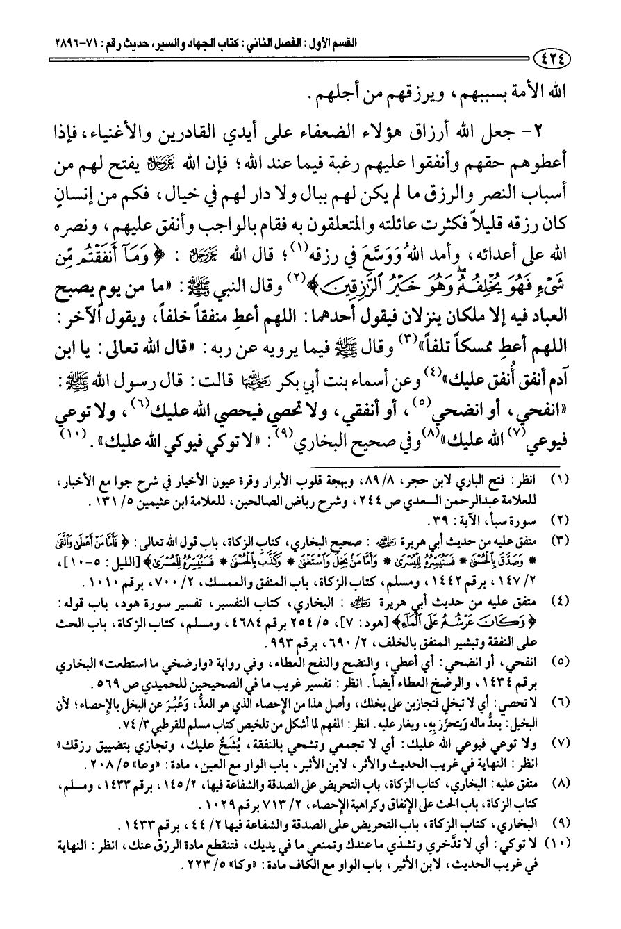 (¬10) لا توكي: أي لا تدَّخري وتشدي ما عندك وتمنعي ما في يديك، فتنقطع مادة الرزق عنك، انظر: النهاية في غريب الحديث، لابن الأثير، باب الواو مع الكاف مادة: " وكا " 5/ 223.