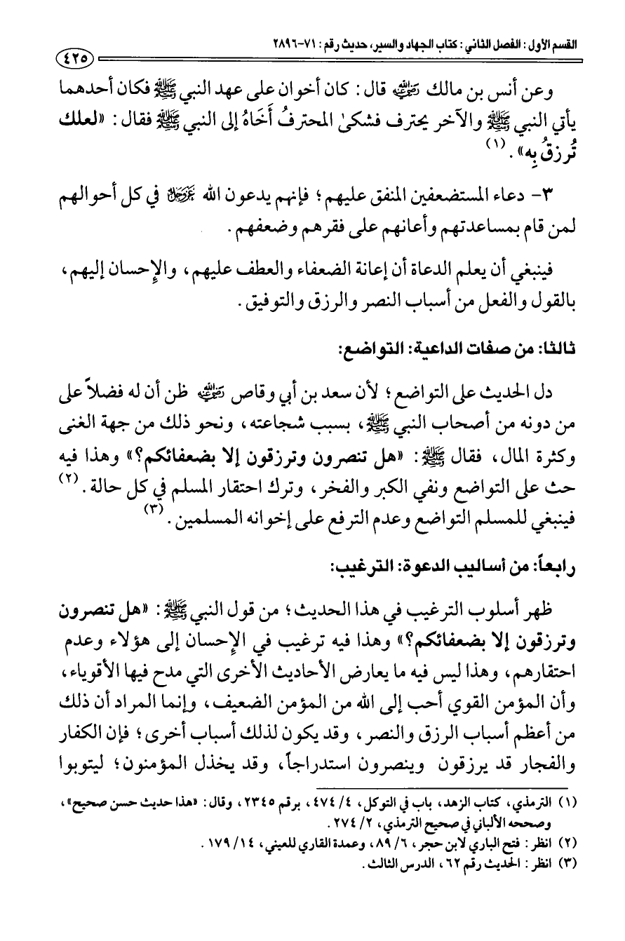 ثالثا: من صفات الداعية: التواضع: دل الحديث على التواضع؛ لأن سعد بن أبي وقاص رضي الله عنه ظن أن له فضلا على من دونه من أصحاب النبي صلى الله عليه وسلم، بسبب شجاعته، ونحو ذلك من جهة الغنى وكثرة المال، فقال صلى الله عليه وسلم: «هل تنصرون وترزقون إلا بضعفائكم؟» وهذا فيه حث على التواضع ونفي الكبر والفخر، وترك احتقار المسلم في كل حالة (¬2).