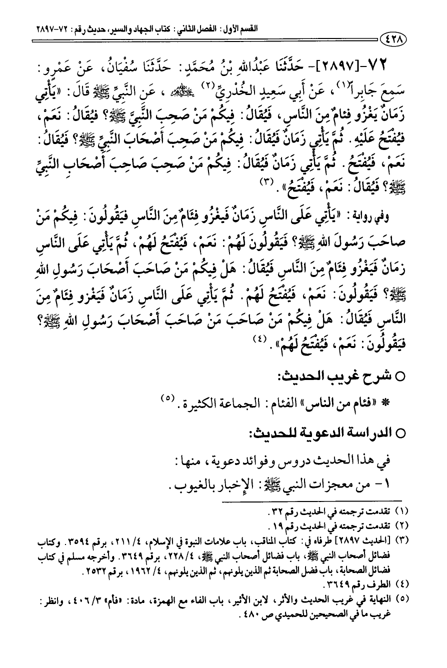 72 - [2897] حَدَّثَنَا عبد الله بْن محَمَّدٍ: حَدَّثَنَا سفْيَان، عَنْ عَمْرو: سَمِعَ جَابِرا (¬1) عَنْ أَبِي سَعِيدٍ الخدْرِيِّ (¬2) رضي الله عنه، عَنِ النَّبِيِّ صلى الله عليه وسلم قالَ: «يَأْتِي زَمَان يَغْزو فِئام مِنَ النَّاسِ، فَيقَال: فِيكمْ مَنْ صَحِبَ النَّبِيَّ صلى الله عليه وسلم؟ فيقَال: نَعَمْ، فيفتح عَلَيْهِ. ثمَّ يأتي زَمَان فَيقَال: فِيكمْ مَنْ صَحِبَ أَصْحَابَ النَّبِيِّ صلى الله عليه وسلم؟ فَيقَال: نَعَمْ، فَيفْتَح. ثمَّ يأتِي زَمَان فَيقَال: فِيكمْ مَنْ صَحِبَ صَاحِبَ أَصْحَاب النَّبيِّ صلى الله عليه وسلم؛ فَيقَال: نَعَمْ، فَيفْتَح» (¬3).