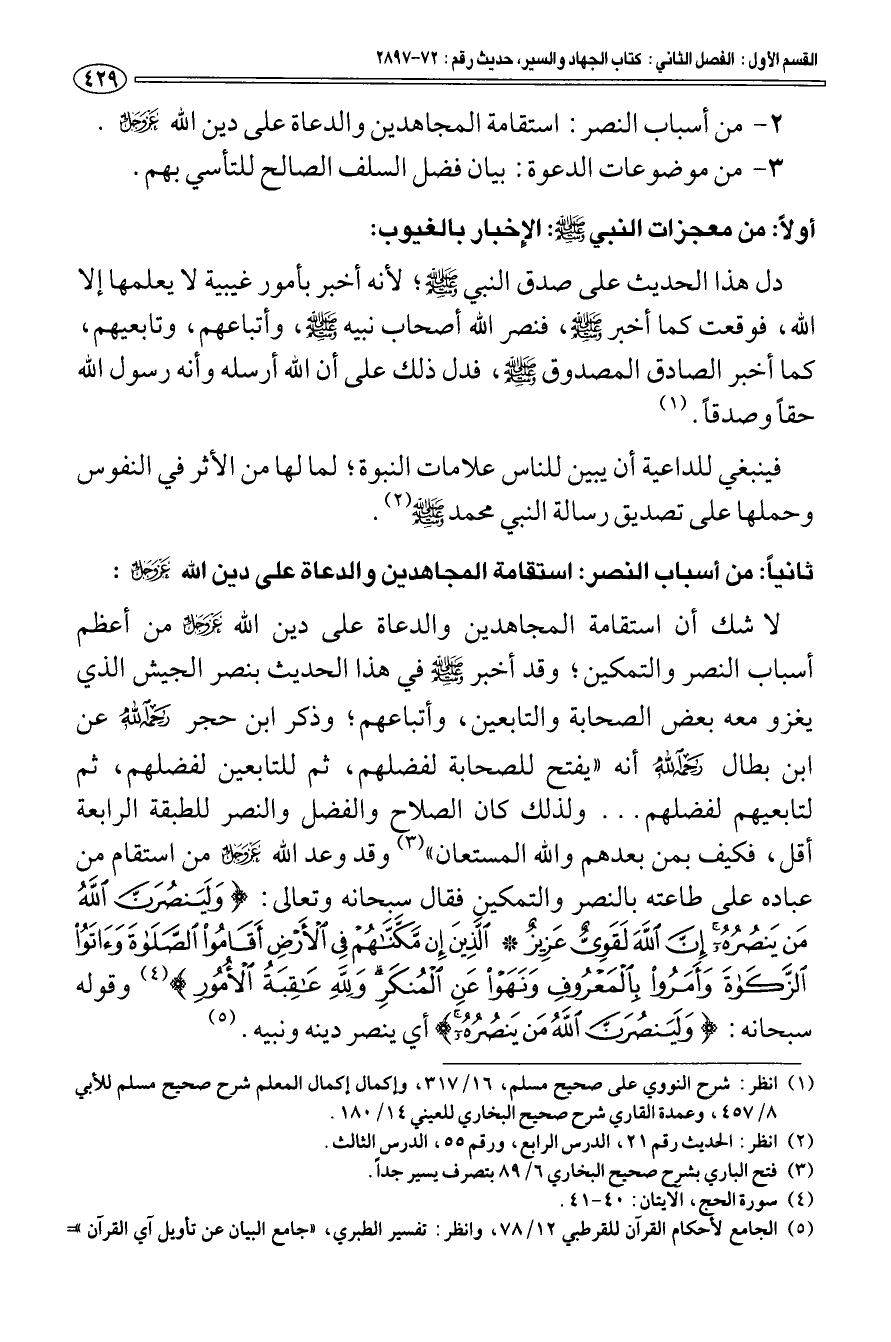 ثانيا: من أسباب النصر: استقامة المجاهدين والدعاة على دين الله عز وجل: لا شك أن استقامة المجاهدين والدعاة على دين الله عز وجل من أعظم أسباب النصر والتمكين؛ وقد أخبر صلى الله عليه وسلم في هذا الحديث بنصر الجيش الذي يغزو معه بعض الصحابة والتابعين، وأتباعهم؛ وذكر ابن حجر رحمه الله عن ابن بطال رحمه الله أنه " يفتح للصحابة لفضلهم، ثم للتابعين لفضلهم، ثم لتابعيهم لفضلهم. . . ولذلك كان الصلاح والفضل والنصر للطبقة الرابعة أقل، فكيف بمن بعدهم والله المستعان " (¬3) وقد وعد الله عز وجل من استقام من عباده على طاعته بالنصر والتمكين فقال سبحانه وتعالى: {وَلَيَنْصُرَنَّ اللَّهُ مَنْ يَنْصُرُهُ إِنَّ اللَّهَ لَقَوِيٌّ عَزِيزٌ - الَّذِينَ إِنْ مَكَّنَّاهُمْ فِي الْأَرْضِ أَقَامُوا الصَّلَاةَ وَآتَوُا الزَّكَاةَ وَأَمَرُوا بِالْمَعْرُوفِ وَنَهَوْا عَنِ الْمُنْكَرِ وَلِلَّهِ عَاقِبَةُ الْأُمُورِ} [الحج: 40 - 41] (¬4) وقوله سبحانه: {وَلَيَنْصُرَنَّ اللَّهُ مَنْ يَنْصُرُهُ} [الحج: 40] أي ينصر دينه ونبيه (¬5).
