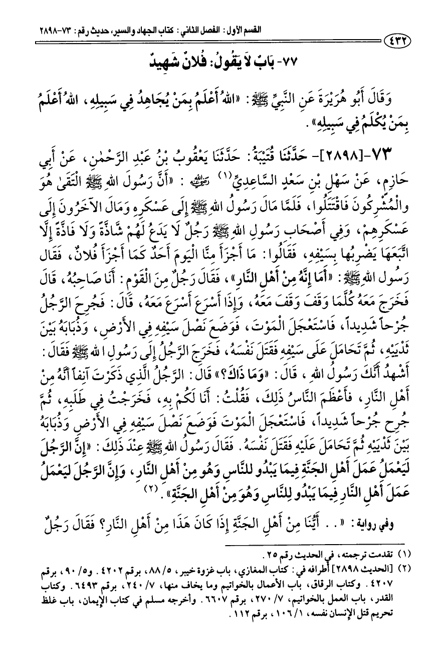 73 - [2898] حَدَّثَنَا قتَيْبَة: حَدَّثَنَا يَعْقوب بْن عَبْدِ الرَّحْمنِ، عَنْ أَبِي حَازِمٍ، عَنْ سَهْلِ بْنِ سَعْدٍ الساعِدِيِّ (¬1) رضي الله عنه: «أَنَّ رَسولَ اللهِ صلى الله عليه وسلم الْتَقَى هوَ والْمشْرِكونَ فَاقْتَتَلوا، فَلَمَّا مَالَ رَسول اللهِ صلى الله عليه وسلم إلَى عَسْكَرِهِ وَمَالَ الآخَرونَ إِلَى عَسْكَرِهِمْ، وَفِي أَصْحَابِ رَسولِ اللهِ صلى الله عليه وسلم رَجل لَا يَدَع لَهمْ شَّاذَّة وَلَا فَاذَّة إِلَّا اتَّبَعَهَا يَضرِبها بِسَيْفِهِ، فَقَالوا: مَا أَجْزَأَ مِنَّا الْيَومَ أَحَد كَمَا أَجْزَأَ فلان، فَقَال رِسول اللهِ صلى الله عليه وسلم: " أَمَا إِنَّه مِنْ أَهْلِ النَّارِ "، فَقَالَ رَجل مِنَ الْقَوْمِ: أنا صَاحِبه، قَالَ فخَرَجَ مَعَه كلَّمَا وَقَفَ وَقَفَ مَعَه، وَإِذَا أَسْرَعَ أَسْرَعَ مَعَه، قالَ: فَجرِحَ الرَّجل جرْحا شَدِيدا، فَاسْتَعْجَلَ الْموتَ، فَوَضَعَ نَصْلَ سَيْفِهِ فِي الأَرْضِ، وَذبَابَه بَيْنَ ثَدْيَيْهِ، ثمَّ تَحَامَلَ عَلَى سَيْفهِ فَقَتَلَ نَفْسَه، فخَرَجَ الرَّجل إِلَى رَسولِ الله صلى الله عليه وسلم فقَالَ: أَشْهد أنكَ رَسول اللهِ، قَالَ: " وَمَا ذَاك؟ " قَال: الرَّجل الَّذِي ذَكَرْتَ آنِفا أنه مِنْ أَهْلِ النَّارِ، فأَعْظَمَ النَّاس ذَلِكَ، فَقلْت: أَنا لَكمْ بِهِ، فَخَرَجْت فِي طَلَبِهِ، ثمَّ جرِح جرْحا شَدِيدا، فَاسْتَعْجَلَ الْمَوْتَ فَوَضَعَ نَصْلَ سَيْفِهِ فِي الأَرْضِ وَذبَابَه بَيْنَ ثَدْيَيْهِ ثمَّ تَحَامَلَ عَلَيْهِ فَقَتَلَ نَفْسَه. فَقَالَ رَسول اللهِ صلى الله عليه وسلم عِنْدَ ذَلِكَ: " إِنَّ الرَّجلَ لَيَعْمَل عَمَلَ أَهْلِ الجَنَّةِ فِيمَا يَبْدو للنَّاسِ وَهو مِنْ أَهْلِ النَّارِ، وَإِنَّ الرَّجلَ ليَعْمَل عَمَلَ أَهْلِ النَّارِ فِيمَا يَبْدو لِلنَّاسِ وَهوَ مِنْ أَهْلِ الجَنَّةِ» (¬2).
