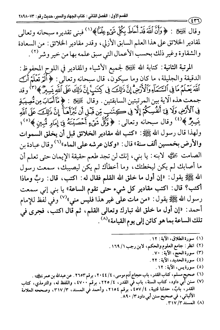 المرتبة الثانية: كتابة الله عز وجل لجميع الأشياء والمقادير في اللوح المحفوظ: الدقيقة والجليلة، ما كان وما سيكون، قال سبحانه وتعالى: {أَلَمْ تَعْلَمْ أَنَّ اللَّهَ يَعْلَمُ مَا فِي السَّمَاءِ وَالْأَرْضِ إِنَّ ذَلِكَ فِي كِتَابٍ إِنَّ ذَلِكَ عَلَى اللَّهِ يَسِيرٌ} [الحج: 70] (¬3) وقد جمعت هذه الآية بين المرتبتين السابقتين. وقال عز وجل: {مَا أَصَابَ مِنْ مُصِيبَةٍ فِي الْأَرْضِ وَلَا فِي أَنْفُسِكُمْ إِلَّا فِي كِتَابٍ مِنْ قَبْلِ أَنْ نَبْرَأَهَا إِنَّ ذَلِكَ عَلَى اللَّهِ يَسِيرٌ} [الحديد: 22] (¬4) وقال سبحانه وتعالى: {وَكُلَّ شَيْءٍ أحْصَيْنَاهُ فِي إِمَامٍ مُبِينٍ} [يس: 12] (¬5)؛ ولهذا قال رسول الله صلى الله عليه وسلم: «كتب الله مقادير الخلائق قبل أن يخلق السماوات والأرض بخمسين ألف سنة» قال: «وكان عرشه على الماء» (¬6). وقال عبادة بن الصامت رضي الله عنه لابنه: يا بني، إنك لن تجد طعم حقيقة الإِيمان حتى تعلم أن ما أصابك لم يكن ليخطئك، وما أخطأك لم يكن ليصيبك، سمعت رسول الله صلى الله عليه وسلم يقول: «إن أول ما خلق الله القلم فقال له: اكتب، قال: ربِّ وماذا أكتب؛ قال: اكتب مقادير كل شيء حتى تقوم الساعة» يا بني إني سمعت رسول الله صلى الله عليه وسلم يقول: «من مات على غير هذا فليس مني» (¬7) وفي لفظ للإِمام أحمد: «إن أول ما خلق الله تبارك وتعالى القلم، ثم قال اكتب، فجرى في تلك الساعة بما هو كائن إلى يوم القيامة» (¬8).