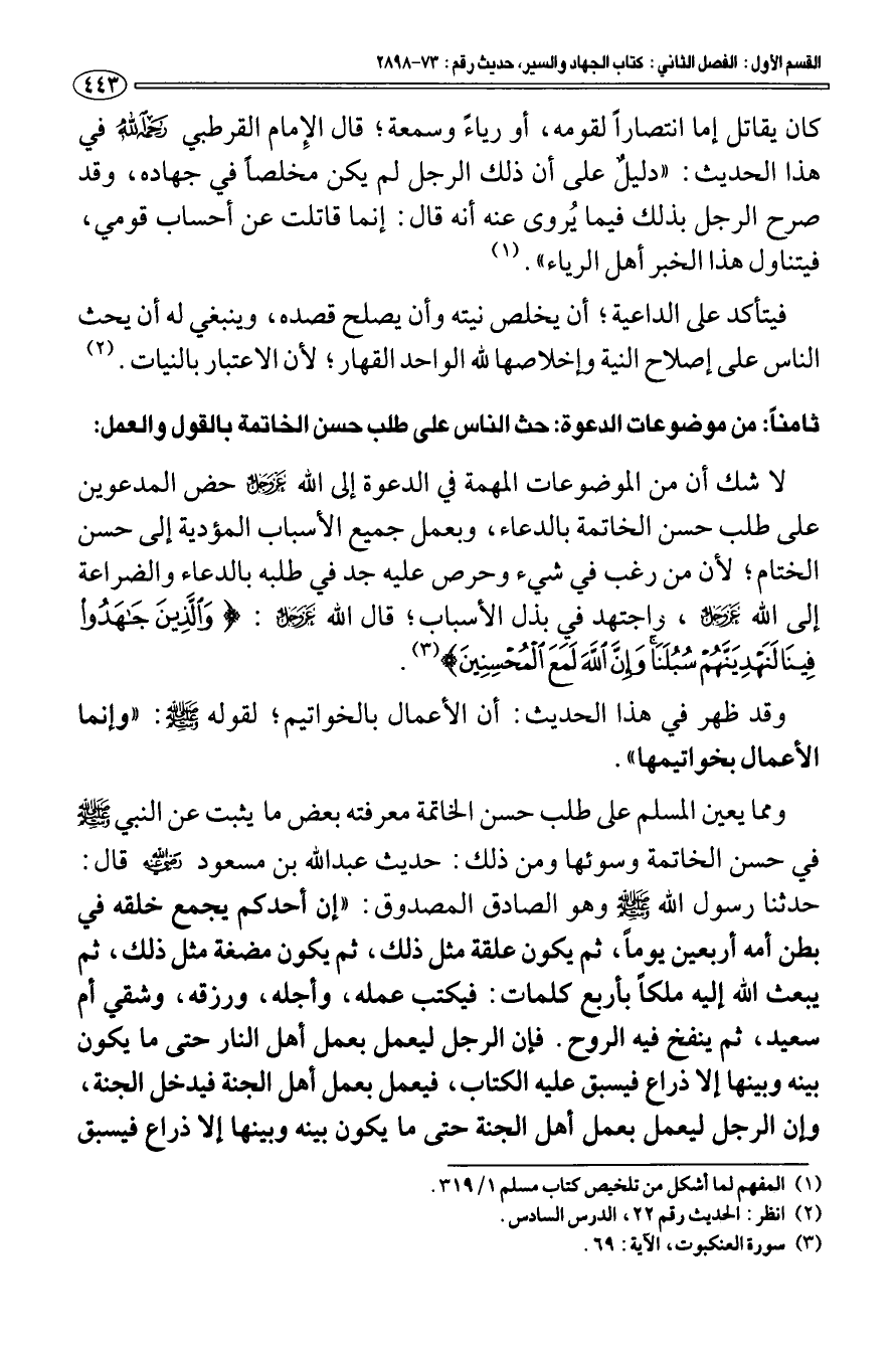 ثامنا: من موضوعات الدعوة: حث الناس على طلب حسن الخاتمة بالقول والعمل: لا شك أن من الموضوعات المهمة في الدعوة إلى الله عز وجل حض المدعوين على طلب حسن الخاتمة بالدعاء، وبعمل جميع الأسباب المؤدية إلى حسن الختام؛ لأن من رغب في شيء وحرص عليه جد في طلبه بالدعاء والضراعة إلى الله عز وجل، واجتهد في بذل الأسباب؛ قال الله عز وجل: {وَالَّذِينَ جَاهَدُوا فِينَا لَنَهْدِيَنَّهُمْ سُبُلَنَا وَإِنَّ اللَّهَ لَمَعَ الْمُحْسِنِينَ} [العنكبوت: 69] (¬3) وقد ظهر في هذا الحديث: أن الأعمال بالخواتيم؛ لقوله صلى الله عليه وسلم: «وإنما الأعمال بخواتيمها».
