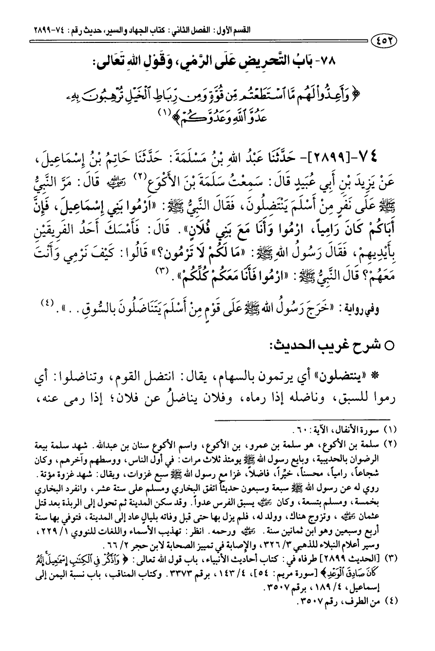 74 - [2899] حَدَّثَنَا عَبْد اللهِ بْن مَسْلَمَةَ: حَدَّثَنَا حَاتِم بْن إِسْمَاعِيلَ، عَنْ يَزِيدَ بْنٍ أَبِي عبَيدٍ قَالَ: سَمِعْت سَلَمَةَ بْنَ الأَكْوَعِ (¬2) رضي الله عنه قَالَ: «مَرَّ النَّبِيّ صلى الله عليه وسلم علَى نَفرٍ مِنْ أَسْلَمَ يَنتَضِلونَ، فَقَالَ النَّبِيّ صلى الله عليه وسلم: " ارْموا بَنِي إِسْمَاعِيلَ، فَإِنَّ أَبَاكمْ كَانَ رَامِيا، ارْموا وَأَنَا مَعَ بَنِي فلَانٍ ". قَالَ: فَأَمْسَكَ أَحَد الفَرِيقَيْنِ بِأَيْدِيهِمْ، فَقَالَ رَسول اللهِ صلى الله عليه وسلم: " مَا لَكمْ لَا تَرْمون؟ " قَالوا: كَيْفَ نَرْمِي وَأَنْتَ مَعَهمْ؛ قَالَ النَّبِيّ صلى الله عليه وسلم: " ارْموا فأنا مَعَكمْ كلِّكمْ» (¬3).