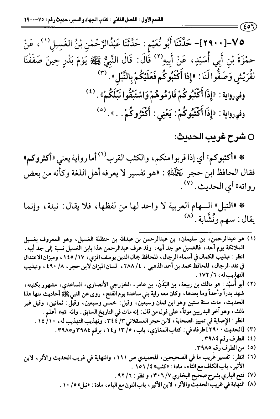 75 - [2900] حَدَّثَنَا أَبو نعْيم: حَدَّثَنَا عَبْد الرَّحْمَن بْن الغَسِيلِ (¬1) عَنْ حمْزَةَ بْنِ أَبِي أسَيْدٍ، عَنْ أَبِيهِ (¬2) قَالَ: «قَالَ النَّبِيّ صلى الله عليه وسلم يَوْمَ بَدْرٍ حِينَ صَفَفْنَا لقرَيْشٍ وَصَفّوا لَنَا: " إِذا أَكْثَبوكم فَعَلَيْكمْ بِالنَّبْلِ» (¬3).