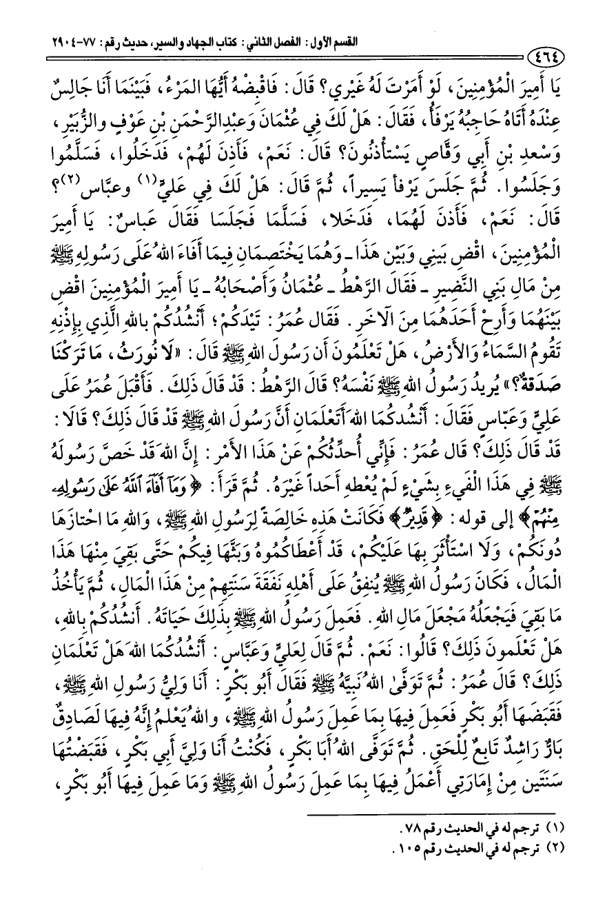 يَا أَمِيرَ الْمؤمِنِينَ، لَوْ أَمَرْتَ لَه غَيْري؟ قَالَ: فَاقْبِضْه أَيّهَا المَرْء، فَبَيْنَمَا أنا جَالِس عِنْدَه أتاه حَاجِبه يَرْفَأ، فَقَالَ: هَلْ لَكَ فِي عثْمَانَ وَعبْدِ الرَّحْمَنِ بْنِ عَوْفٍ والزّبَيْرِ، وَسْعدِ بْنِ أَبِي وقَاصٍ يَسْتأْذنونَ؟ قَالَ: نَعَمْ، فَأَذِنَ لَهمْ، فَدَخَلوا، فَسَلَّموا وَجَلَسوا. ثمَّ جَلَسَ يَرْفأ يَسِيرا، ثمَّ قَالَ: هَلْ لَكَ فِي عَليٍّ (¬1) وعبَّاس (¬2)؟ قَالَ: نَعم، فَأَذنَ لَهمَا، فَدَخَلا، فَسَلَّمَا فَجَلَسَا فَقَالَ عَباس: يَا أَمِيرَ الْمؤمِنِينَ، اقْضِ بَينِي وَبَيْن هَذَا - وَهمَا يَخْتَصِمَانِ فِيمَا أَفَاءَ الله عَلَى رَسولِهِ صلى الله عليه وسلم مِنْ مَالِ بَنِي النَّضِيرِ- فَقَالَ الرَّهْط - عثْمَان وَأَصْحَابه- يَا أَمِيرَ الْمؤمِنِينَ اقْضِ بَيْنَهمَا وَأَرِحْ أَحَدَهمَا مِنَ الآخَرِ. فَقَال عمَر: تَيْدَكمْ؛ أنشدكمْ باللهِ الَّذِي بِإِذْنِهِ تَقوم السَّمَاء وَالأَرْض، هَلْ تَعْلَمونَ أَن رَسولَ اللهِ صلى الله عليه وسلم قالَ: " لَا نورَث، مَا تَرَكْنَا صَدَقة؟ " يريد رَسول اللهِ صلى الله عليه وسلم نَفْسَه؛ قَالَ الرَّهْط: قَدْ قَالَ ذَلِكَ. فَأَقْبَلَ عمَر عَلَى عَلِيٍّ وَعَبّاسٍ فَقَالَ: أَنشدكمَا اللهَ أَتَعْلَمَانِ أَنَّ رَسولَ اللهِ صلى الله عليه وسلم قدْ قَالَ ذَلِكَ؟ قَالَا: قَدْ قَالَ ذَلِكَ؛ قَال عمَر: فَإِنِّي أحدِّثكمْ عَنْ هَذَا الأَمْر: إِنَّ اللهَ قَدْ خَصَّ رَسولَه صلى الله عليه وسلم فِي هَذَا الْفَيءِ بشَيْءٍ لَمْ يعْطهِ أَحَدا غَيْرَه. ثمَّ قَرَأَ: {وَمَا أَفَاءَ اللَّهُ عَلَى رَسُولِهِ مِنْهُمْ} [الحشر: 6] إلى قوله: {قَدِيرٌ} [الحشر: 6] فَكَانَتْ هَذِهِ خَالِصَة لِرَسولِ اللهِ صلى الله عليه وسلم، والله مَا احْتازَهَا دونَكمْ، وَلَا اسْتَأْثَرَ بِهَا عَلَيْكمْ، قَدْ أَعْطَاكموه وَبَثَّهَا فِيكمْ حَتَّى بَقِيَ مِنْهَا هَذَا الْمَال، فَكَانَ رَسول اللهِ صلى الله عليه وسلم ينفِق عَلَى أَهْلِهِ نَفَقَةَ سَنَتِهمْ مِنْ هَذَا الْمَالِ، ثمَّ يَأْخذ مَا تقِيَ فَيَجْعَله مَجْعَلَ مَالِ اللهِ. فَعَمِلَ رَسول اللهِ صلى الله عليه وسلم بِذَلِكَ حَيَاتَه. أَنشدكمْ بِاللهِ، هَلْ تَعْلَمونَ ذَلِكَ؟ قَالوا: نَعَمْ. ثمَّ قَالَ لِعَليٍّ وَعَبَّاسٍ: أَنْشدكمَا اللهَ هَلْ تَعْلَمَانِ ذَلِكَ؛ قَالَ عمَر: ثمَّ تَوَفَّى الله نَبيَّه صلى الله عليه وسلم فَقَالَ أَبو بَكْرٍ: أَنَا وَليّ رَسولِ اللهِ صلى الله عليه وسلم، فَقَبَضَهَا أَبو بَكْرٍ فَعَمِلَ فِيهَا بِمَا عَمِلَ رَسول اللهِ صلى الله عليه وسلم، والله يَعْلم إِنَّه فِيهَا لَصَادِق بَارّ رَاشد تَابع لِلْحَقِ. ثمَّ تَوَفَّى الله أَبَا بَكْرٍ، فَكنْت أنا وَلِيَّ أَبِي بَكْرٍ، فَقَبَضْتهَا سَنَتَين مِن إِمَارَتي أَعْمَل فِيهَا بِمَا عَمِلَ رَسول اللهِ صلى الله عليه وسلم وَمَا عَمِلَ فِيهَا أَبو بَكْرٍ،