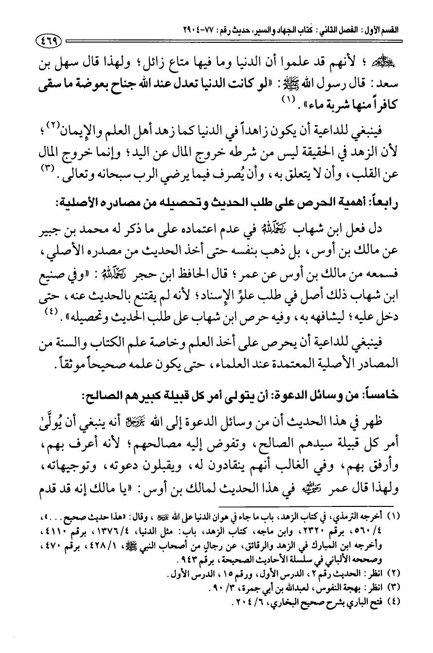 رابعا: أهمية الحرص على طلب الحديث وتحصيله من مصادره الأصلية: دل فعل ابن شهاب رحمه الله في عدم اعتماده على ما ذكر له محمد بن جبير عن مالك بن أوس، بل ذهب بنفسه حتى أخذ الحديث من مصدره الأصلي، فسمعه من مالك بن أوس عن عمر؛ قال الحافظ ابن حجر رحمه الله: " وفي صنيع ابن شهاب ذلك أصل في طلب علوِّ الإِسناد؛ لأنه لم يقتنع بالحديث عنه، حتى دخل عليه؛ ليشافهه به، وفيه حرص ابن شهاب على طلب الحديث وتحصيله " (¬4).