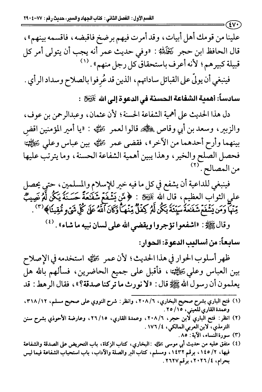 سادسا: أهمية الشفاعة الحسنة في الدعوة إلى الله عز وجل: دل هذا الحديث على أهمية الشفاعة الحسنة؛ لأن عثمان، وعبد الرحمن بن عوف، والزبير، وسعد بن أبي وقاص رضي الله عنهم قالوا لعمر رضي الله عنه: " يا أمير المؤمنين اقضِ بينهما وأرح أحدهما من الآخر "، فقضى عمر رضي الله عنه بين عباس وعلي رضي الله عنهما فحصل الصلح والخير، وهذا يبين أهمية الشفاعة الحسنة، وما يترتب عليها من المصالح (¬2).