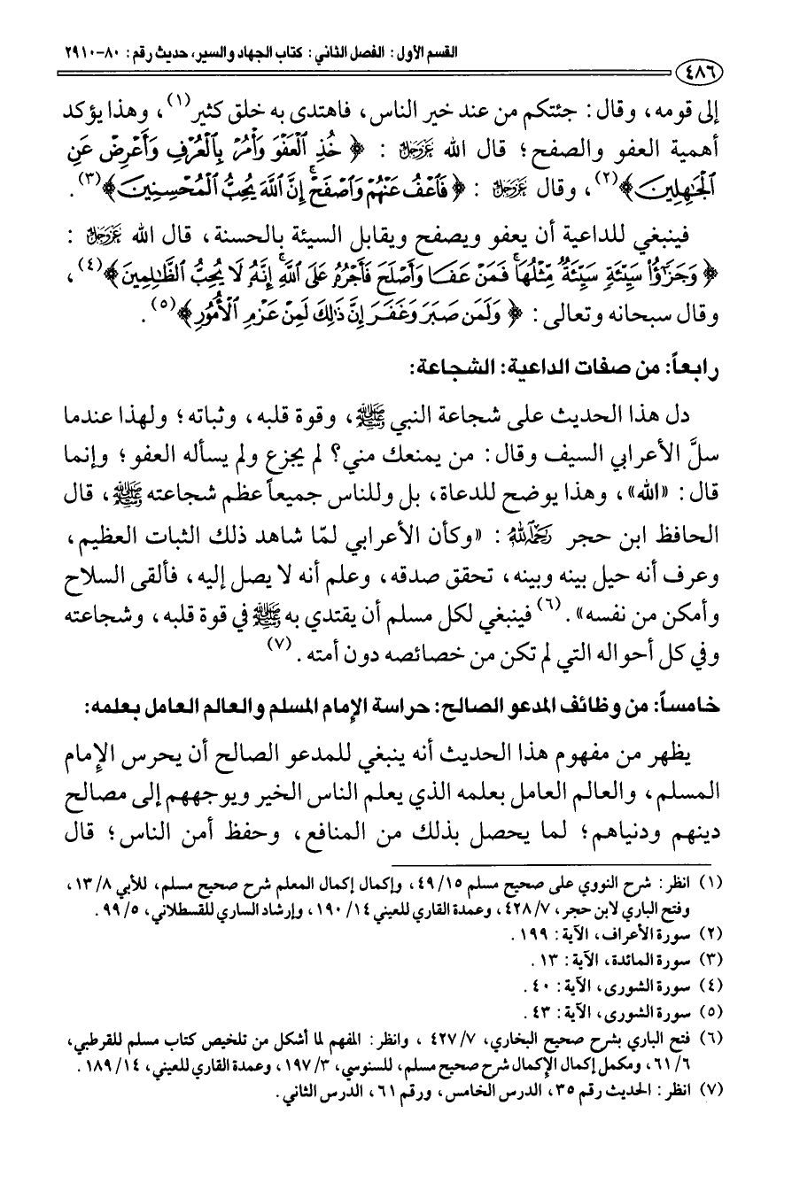 رابعا: من صفات الداعية: الشجاعة: دل هذا الحديث على شجاعة النبي - صلى الله عليه وسلم - وقوة قلبه، وثباته؛ ولهذا عندما سل الأعرابي السيف وقال: من يمنعك مني؛ لم يجزع ولم يسأله العفو؛ وإنما قال: " الله "، وهذا يوضح للدعاة، بل وللناس جميعا عظم شجاعته - صلى الله عليه وسلم - قال الحافظ ابن حجر رحمه الله: " وكأن الأعرابي لمّا شاهد ذلك الثبات العظيم، وعرف أنه حيل بينه وبينه، تحقق صدقه، وعلم أنه لا يصل إليه، فألقى السلاح وأمكن من نفسه " (¬6). فينبغي لكل مسلم أن يقتدي به - صلى الله عليه وسلم - في قوة قلبه، وشجاعته وفي كل أحواله التي لم تكن من خصائصه دون أمته. (¬7).