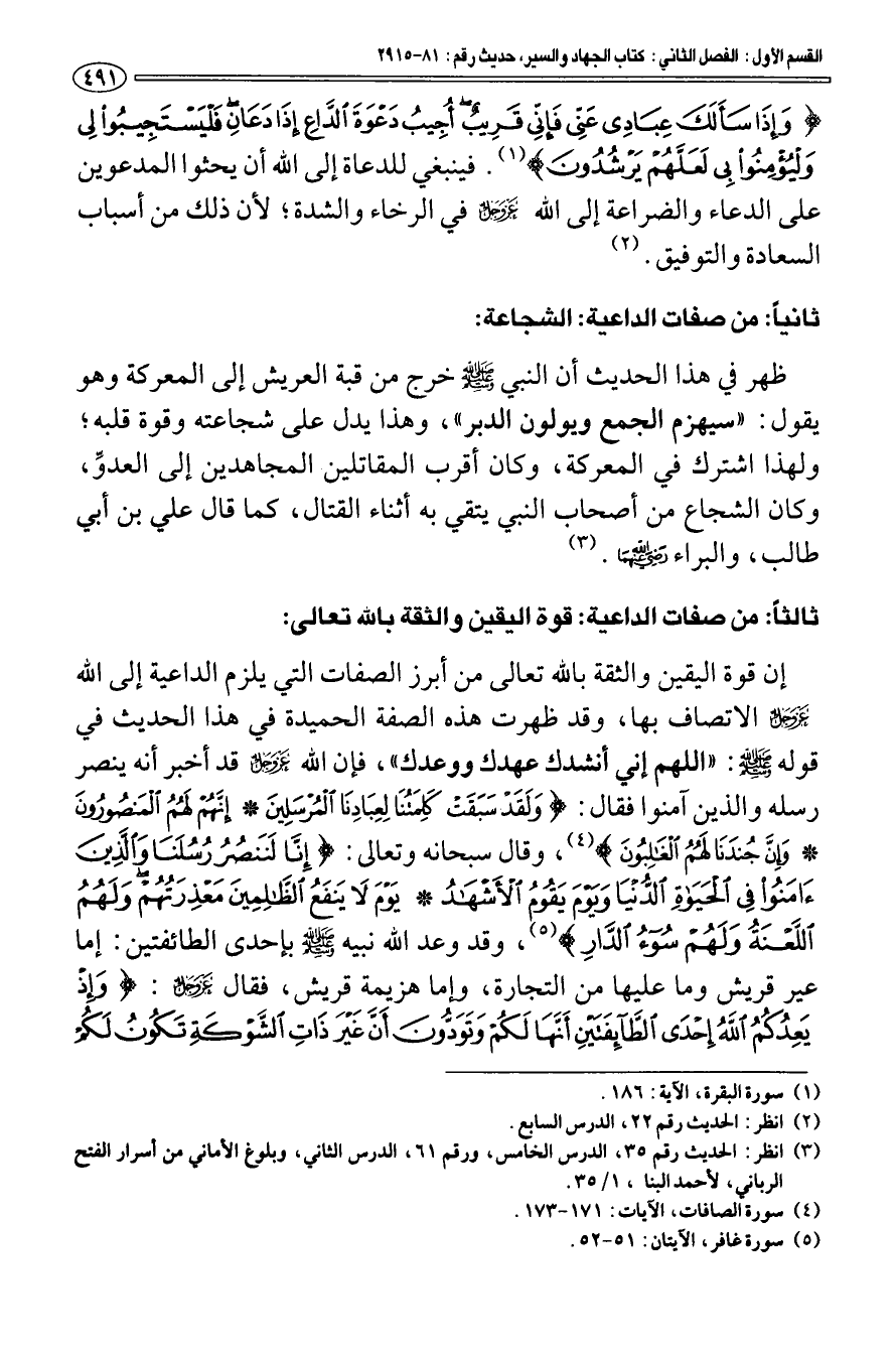 ثانيا: من صفات الداعية: الشجاعة: ظهر في هذا الحديث أن النبي - صلى الله عليه وسلم - خرج من قبة العريش إلى المعركة وهو يقول: {سَيُهْزَمُ الْجَمْعُ وَيُوَلُّونَ الدُّبُرَ} [القمر: 45] وهذا يدل على شجاعته وقوة قلبه؛ ولهذا اشترك في المعركة، وكان أقرب المقاتلين المجاهدين إلى العدو, وكان الشجاع من أصحاب النبي يتقي به أثناء القتال، كما قال على بن أبي طالب، والبراء رضي الله عنهما (¬3).
