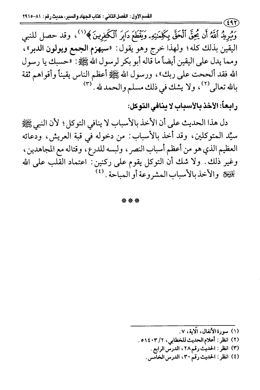 وقد حصل للنبي اليقين بذلك كله؛ ولهذا خرج وهو يقول: {سَيُهْزَمُ الْجَمْعُ وَيُوَلُّونَ الدُّبُرَ} [القمر: 45] ومما يدل على اليقين أيضا ما قاله أبو بكر لرسول الله صلى الله عليه وسلم: " حسبك يا رسول الله فقد ألححت على ربك "، ورسول الله - صلى الله عليه وسلم - أعظم الناس يقينا وأقواهم ثقة بالله تعالى (¬1). ولا يشك في ذلك مسلم والحمد لله (¬2).