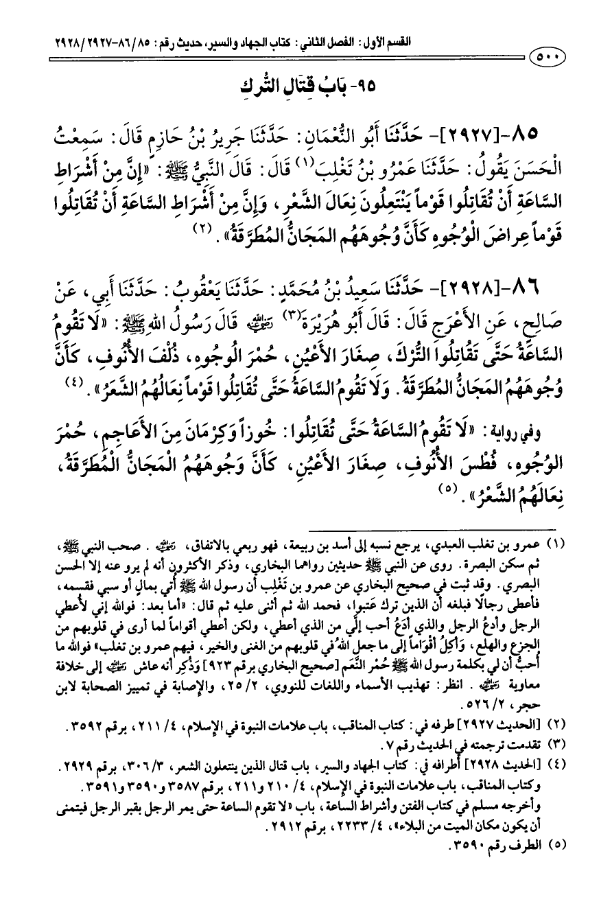 85 - [2927] حدثنا أبو النعمان: حدثنا جرير بن حازم قال: سمعت الحسن يقول: حدثنا عمرو بن تغلب (¬1). قال: قال النبي صلى الله عليه وسلم: «إن من أشراط الساعة أن تقاتلوا قوما ينتعلون نعال الشعر، وإن من أشراط الساعة أن تقاتلوا قوما عراض الوجوه كأن وجوههم المجان المطرقة» (¬2).
