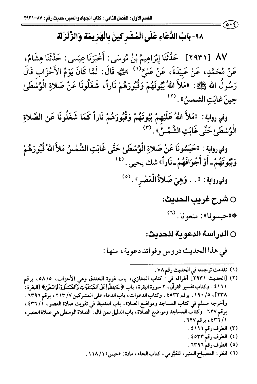 (¬2) [الحديث 2931] أطرافه في: كتاب المغازي، باب غزوة الخندق وهي الأحزاب، 5/ 58، برقم 4111. وكتاب تفسير القرآن، 2 سورة البقرة، باب حافظوا على الصلوات والصلاة الوسطى [البقرة: 238]، 5/ 190، برقم 4533. وكتاب الدعوات، باب الدعاء على المشركين 7/ 213، برقم 6396. وأخرجه مسلم في كتاب المساجد ومواضع الصلاة، باب التغليظ في تفويت صلاة العصر، 1/ 436، برقم 627. وكتاب المساجد ومواضع الصلاة، باب الدليل لمن قال: الصلاة الوسطى هي صلاة العصر، 1/ 436، برقم 627.