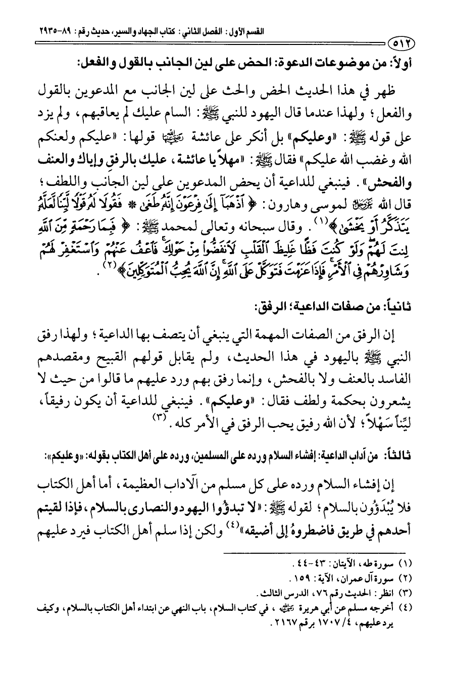 أولا: من موضوعات الدعوة: الحض على لين الجانب بالقول والفعل: ظهر في هذا الحديث الحض والحث على لين الجانب مع المدعوين بالقول والفعل؛ ولهذا عندما قال اليهود للنبي صلى الله عليه وسلم: السام عليك لم يعاقبهم، ولم يزد على قوله صلى الله عليه وسلم: " وعليكم " بل أنكر على عائشة - رضي الله عنها قولها: «عليكم ولعنكم الله وغضب الله عليكم " فقال صلى الله عليه وسلم: " مهلا يا عائشة، عليك بالرفق وإياك والعنف والفحش». فينبغي للداعية أن يحض المدعوين على لين الجانب واللطف؛ قال الله - عز وجل - لموسى وهارون: {اذْهَبَا إِلَى فِرْعَوْنَ إِنَّهُ طَغَى - فَقُولَا لَهُ قَوْلًا لَيِّنًا لَعَلَّهُ يَتَذَكَّرُ أَوْ يَخْشَى} [طه: 43 - 44] (¬1) وقال سبحانه وتعالى لمحمد صلى الله عليه وسلم: {فَبِمَا رَحْمَةٍ مِنَ اللَّهِ لِنْتَ لَهُمْ وَلَوْ كُنْتَ فَظًّا غَلِيظَ الْقَلْبِ لَانْفَضُّوا مِنْ حَوْلِكَ فَاعْفُ عَنْهُمْ وَاسْتَغْفِرْ لَهُمْ وَشَاوِرْهُمْ فِي الْأَمْرِ فَإِذَا عَزَمْتَ فَتَوَكَّلْ عَلَى اللَّهِ إِنَّ اللَّهَ يُحِبُّ الْمُتَوَكِّلِينَ} [آل عمران: 159] (¬2).
