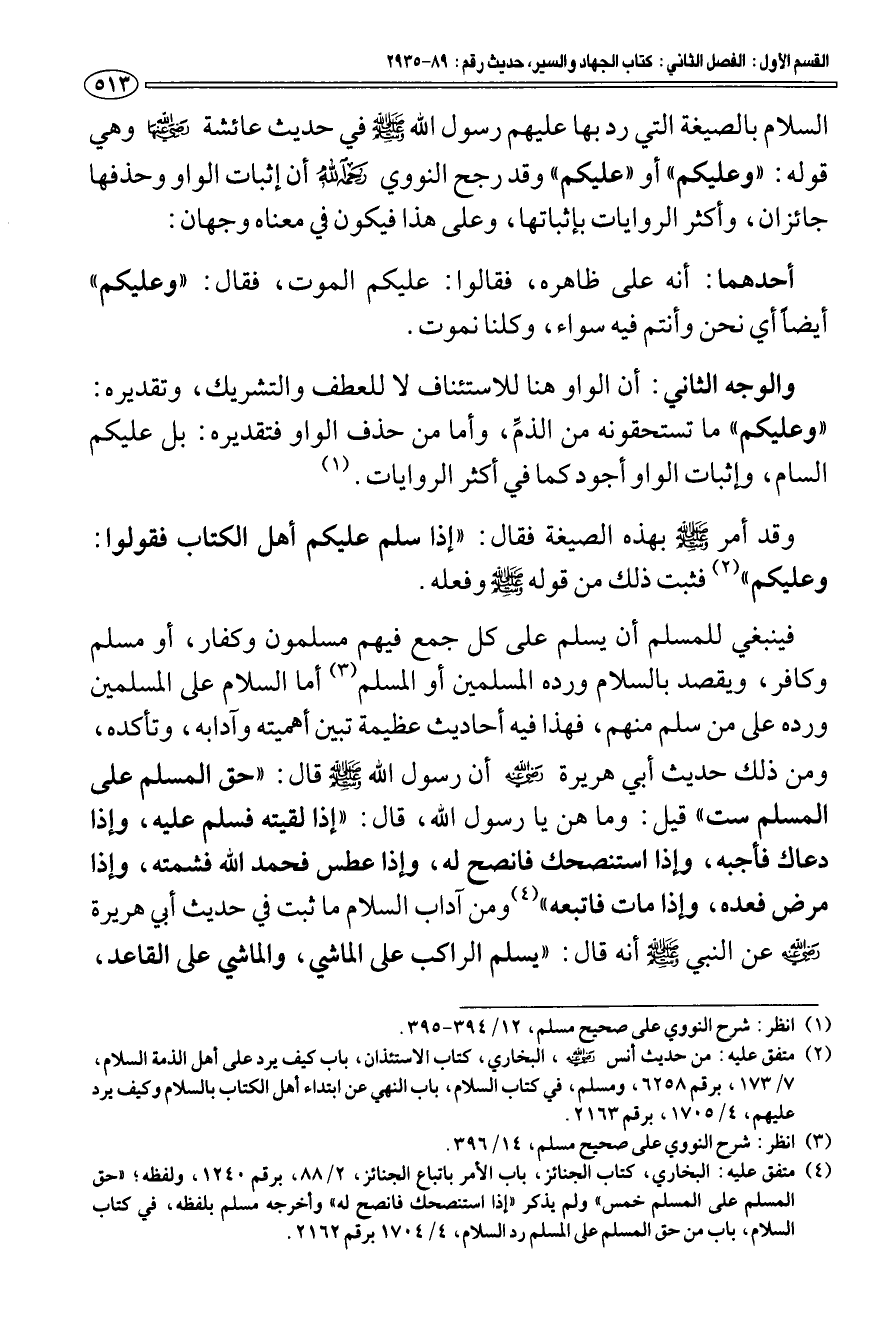 السلام بالصيغة التي رد بها عليهم رسول الله - صلى الله عليه وسلم - في حديث عائشة - رضي الله عنها - وهي قوله: " وعليكم " أو " عليكم " وقد رجح النووي رحمه الله أن إثبات الواو وحذفها جائزان، وأكثر الروايات بإثباتها، وعلى هذا فيكون في معناه وجهان: أحدهما: أنه على ظاهره، فقالوا: عليكم الموت، فقال: " وعليكم " أيضا أي نحن وأنتم فيه سواء، وكلنا نموت.