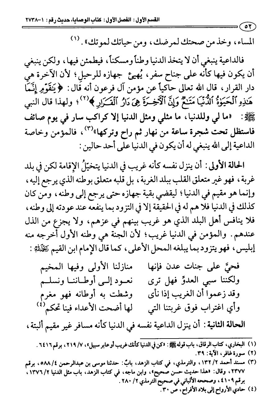 الحالة الأولى: أن ينزل نفسه كأنه غريب في الدنيا يتخيّلُ الإِقامة لكن في بلد غربة، فهو غير متعلق القلب ببلد الغربة، بل قلبه متعلق بوطنه الذي يرجع إليه، وإنما هو مقيم في الدنيا؛ ليقضي بقية جهازه حتى يرجع إلى وطنه، ومن كان كذلك في الدنيا فلا هم له في الحقيقة إلا في التزود بما ينفعه عند عودته إلى وطنه، فلا ينافس أهل البلد الذي هو غريب بينهم في عزهم، ولا يجزع من الذل عندهم. والمؤمن في الدنيا غريب؛ لأن الجنة هي وطنه الأول أخرجه منه إبليس، فهو يتزود بما يبلغه المحل الأعلى، كما قال الإمام ابن القيم رحمه الله: