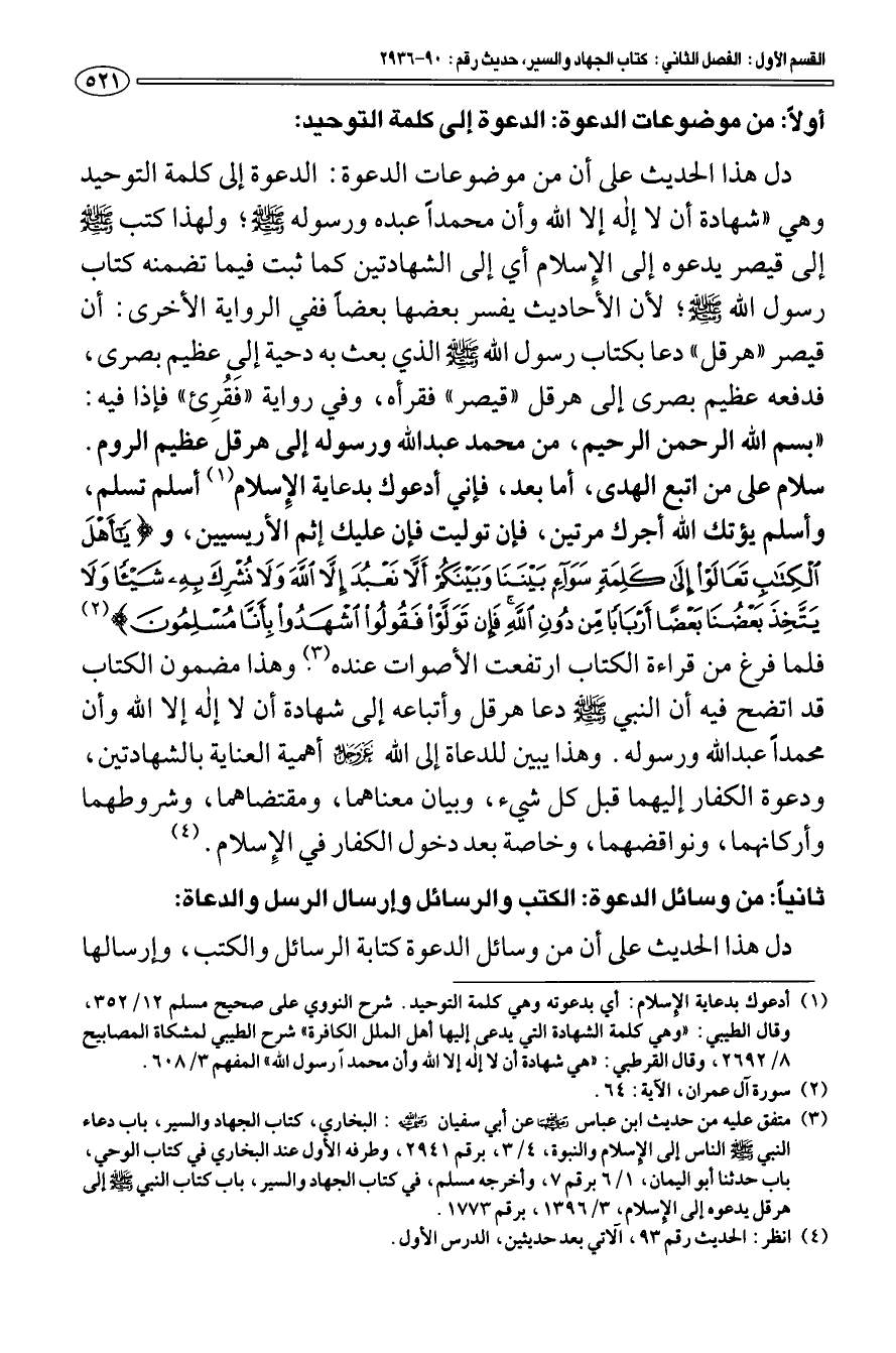 (¬3) متفق عليه من حديث ابن عباس - رضي الله عنهما - عن أبي سفيان رضي الله عنه: البخاري، كتاب الجهاد والسير، باب دعاء النبي - صلى الله عليه وسلم - الناس إلى الإسلام والنبوة، 4/ 3، برقم 2941، وطرفه الأول عند البخاري في كتاب الوحي، باب حدثنا أبو اليمان، 1/ 6 برقم 7، وأخرجه مسلم، في كتاب الجهاد والسير، باب كتاب النبي - صلى الله عليه وسلم - إلى هرقل يدعوه إلى الإسلام، 3/ 1396، برقم 1773.