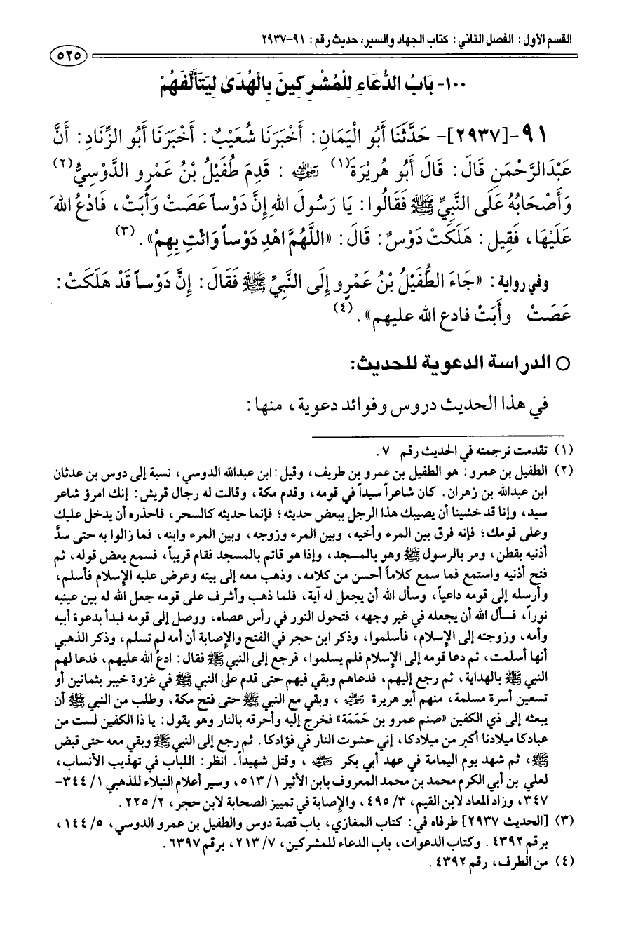 91 - [2937] حدثنا أبو اليمان: أخبرنا شعيب: أخبرنا أبو الزناد: أن عبد الرحمن قال: قال أبو هريرة (¬1). رضي الله عنه: قدم طفيل بن عمرو الدوسي (¬2). وأصحابه على النبي - صلى الله عليه وسلم - فقالوا: يا رسول الله إن دوسا عصت وأبت، فادع الله عليها، فقيل: هلكت دوس: قال: «اللهم اهد دوسا وائت بهم» (¬3).