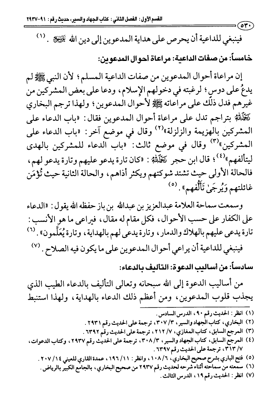 خامسا: من صفات الداعية: مراعاة أحوال المدعوين: إن مراعاة أحوال المدعوين من صفات الداعية المسلم؛ لأن النبي - صلى الله عليه وسلم - لم يدع على دوس؛ لرغبته في دخولهم الإسلام، ودعا على بعض المشركين من غيرهم فدل ذلك على مراعاته - صلى الله عليه وسلم - لأحوال المدعوين، ولهذا ترجم البخاري رحمه الله بتراجم تدل على مراعاة أحوال المدعوين فقال: " باب الدعاء على المشركين بالهزيمة والزلزلة " (¬2). وقال في موضع آخر: " باب الدعاء على المشركين " (¬3). وقال في موضع ثالث: " باب الدعاء للمشركين بالهدى ليتألفهم " (¬4). قال ابن حجر رحمه الله: " كان تارة يدعو عليهم وتارة يدعو لهم، فالحالة الأولى حيث تشتد شوكتهم ويكثر أذاهم، والحالة الثانية حيث تؤمن غائلتهم ويرجى تألفهم " (¬5).