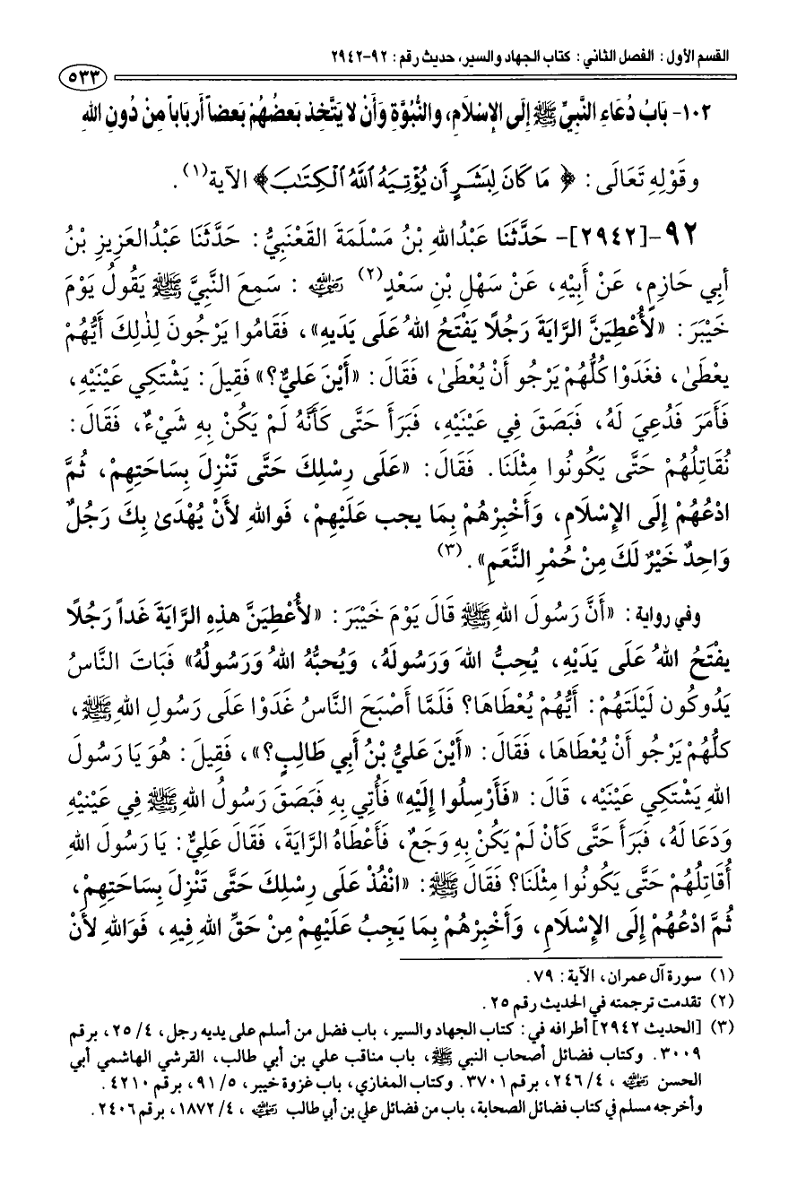 (¬3) [الحديث 2942] أطرافه في: كتاب الجهاد والسير، باب فضل من أسلم على يديه رجل، 4/ 25، برقم 3009. وكتاب فضائل أصحاب النبي صلى الله عليه وسلم، باب مناقب علي بن أبي طالب، القرشي الهاشمي أبي الحسن رضي الله عنه، 4/ 246، برقم 3701. وكتاب المغازي، باب غزوة خيبر، 5/ 91، برقم 4210 وأخرجه مسلم في كتاب فضائل الصحابة، باب من فضائل علي بن أبي طالب رضي الله عنه، 4/ 1872، برقم 2406.