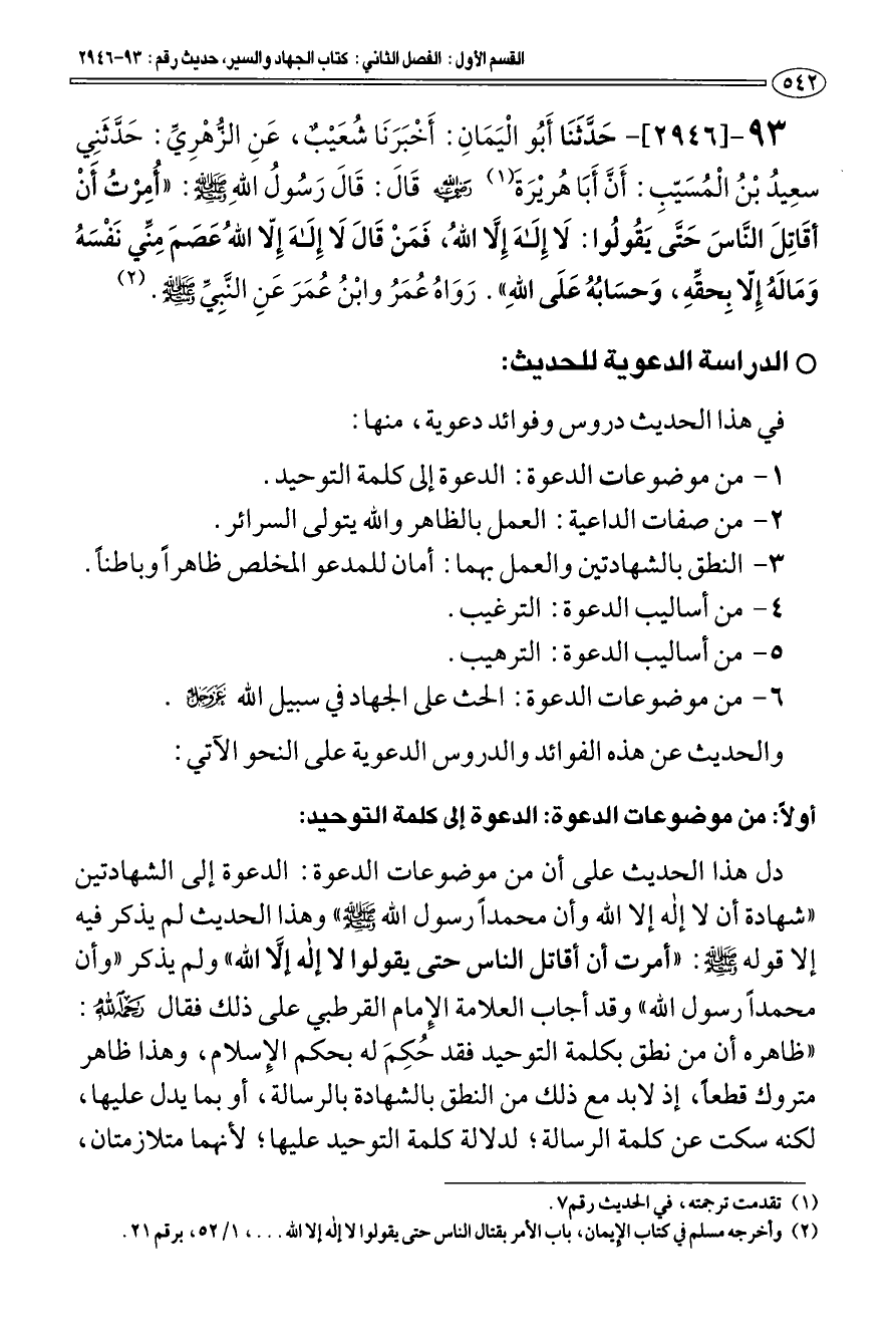 93 - [2946] حدثنا أبو اليمان: أخبرنا شعيب، عن الزهري: حدثني سعيد بن المسيب: أن أبا هريرة (¬1) - رضي الله عنه - قال: قال رسول الله صلى الله عليه وسلم: «أمرت أن أقاتل الناس حتى يقولوا: لا إله إلا الله، فمن قال لا إله إلا الله عصم مني نفسه وماله إلا بحقه، وحسابه على الله». رواه عمر وابن عمر عن النبي صلى الله عليه وسلم (¬2).