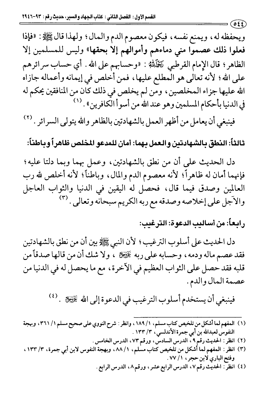 رابعا: من أساليب الدعوة: الترغيب: دل الحديث على أسلوب الترغيب؛ لأن النبي - صلى الله عليه وسلم - بين أن من نطق بالشهادتين فقد عصم ماله ودمه، وحسابه على ربه عز وجل، ولا شك أن من قالها صدقا من قلبه فقد حصل على الثواب العظيم في الآخرة، مع ما يحصل له في الدنيا من عصمة المال والدم.