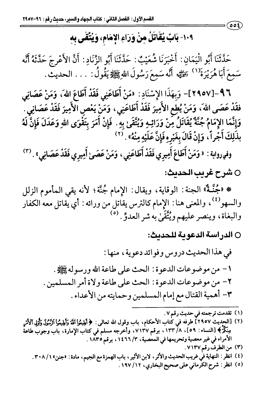 (¬2) [الحديث 2957] طرفه في كتاب الأحكام، باب وقول الله تعالى: (أَطِيعُوا اللَّهَ وَأَطِيعُوا الرَّسُولَ وَأُولِي الْأَمْرِ مِنْكُمْ) [النساء: 59]، 8/ 133، برقم 7137، وأخرجه مسلم في كتاب الإمارة، باب وجوب طاعة الأمراء في غير معصية وتحريمها في المعصية، 3/ 1466، برقم 1835.