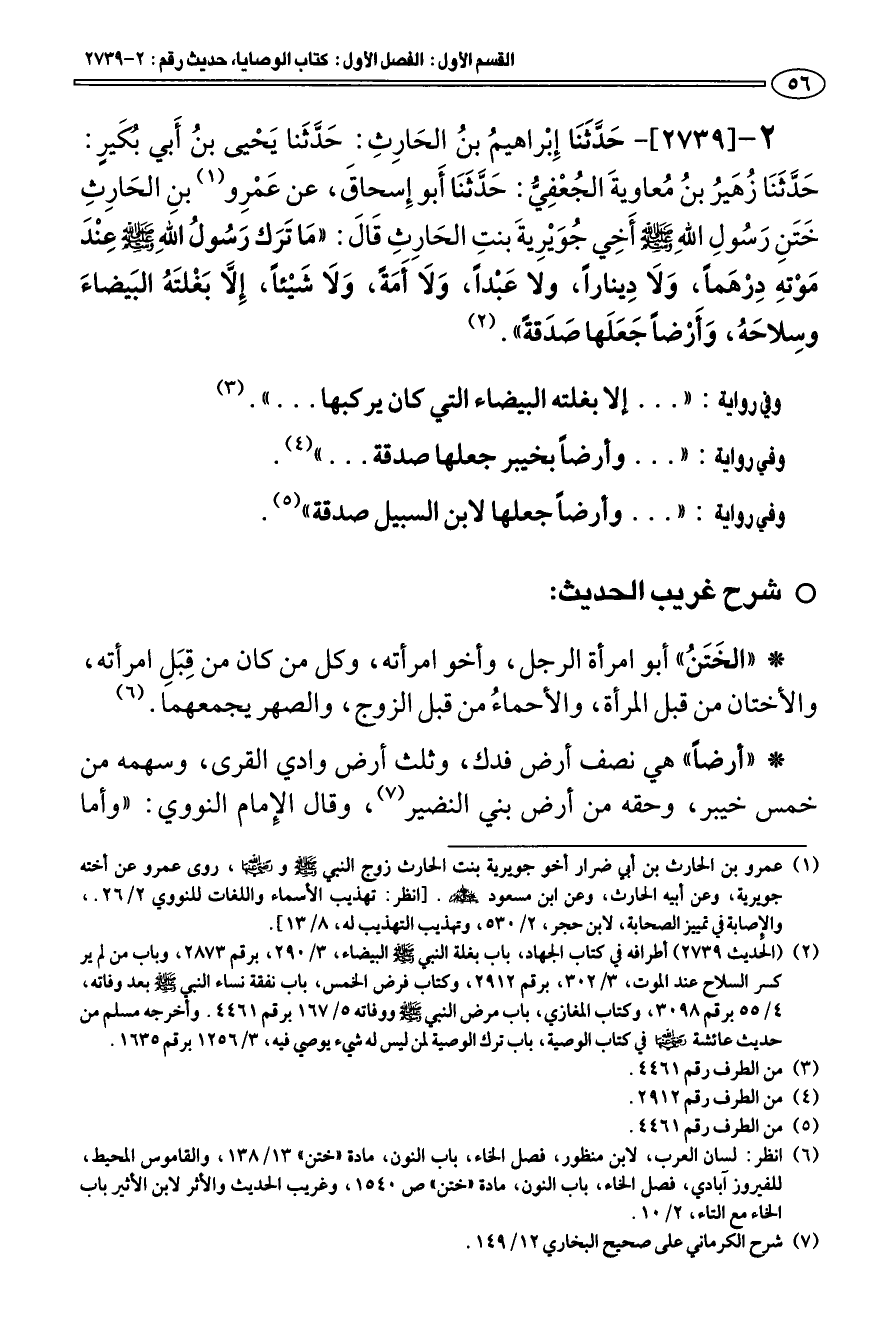 2 - [2739] حَدَّثَنَا إِبْراهيمُ بنُ الحَارِثِ: حَدَّثَنا يَحْيى بنُ أَبي بُكَيرٍ: حَدَّثَنَا زُهَيرُ بنُ مُعاويةَ الجُعْفِيُّ: حَدَّثَنَا أَبو إِسحاقَ، عن عَمْرِو (¬1) بنِ الحَارِثِ خَتَنِ رَسُولِ اللهِ صلى الله عليه وسلم أَخِي جُوَيْرِيةَ بنتِ الحَارِثِ قَالَ: «مَا تَرَك رَسُولُ اللهِ صلى الله عليه وسلم عِنْدَ مَوْتهِ دِرْهَما، وَلَا دِينارا، ولا عَبْدا، وَلَا أَمَة، وَلَا شَيْئا، إِلَّا بَغْلتَهُ البَيضاءَ وسِلاحَهُ، وَأَرْضا جَعَلَها صَدَقة» (¬2).