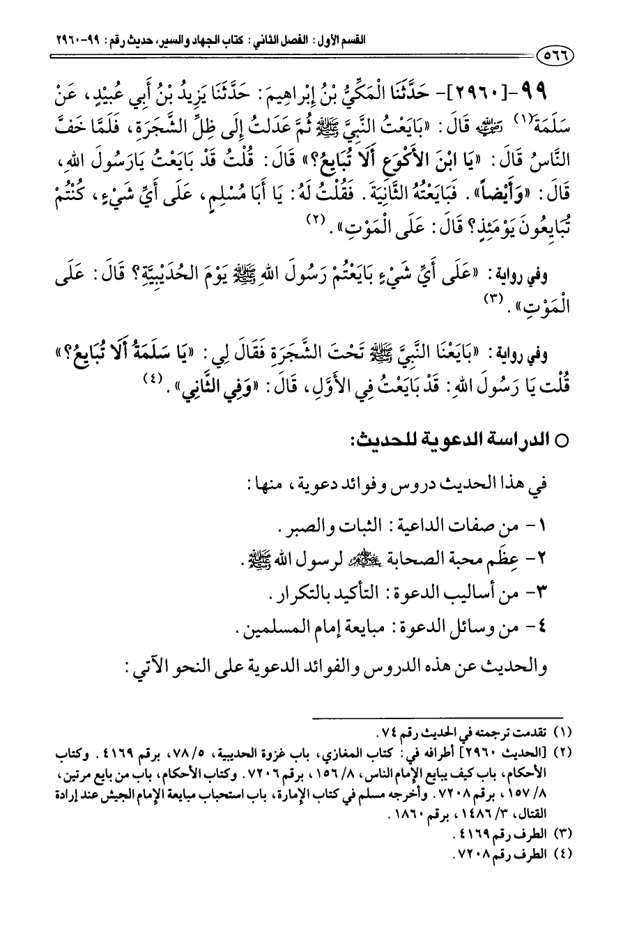 (¬2) [الحديث 2960] أطرافه في: كتاب المغازي، باب غزوة الحديبية، 5/ 78، برقم 4169، وكتاب الأحكام، باب كيف يبايع الإمام الناس، 8/ 156، برقم 7206. وكتاب الأحكام، باب من بايع مرتين، 8/ 157، برقم 7208. وأخرجه مسلم في كتاب الإمارة، باب استحباب مبايعة الإمام الجيش عند إرادة القتال، 3/ 1486، بر قم 1860.