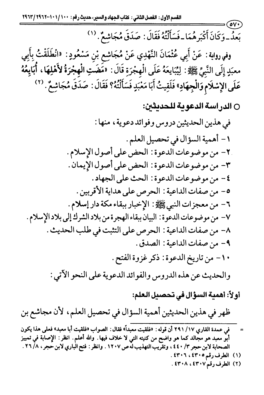 أولا: أهمية السؤال في تحصيل العلم: ظهر في هذين الحديثين أهمية السؤال في تحصيل العلم، لأن مجاشع بن