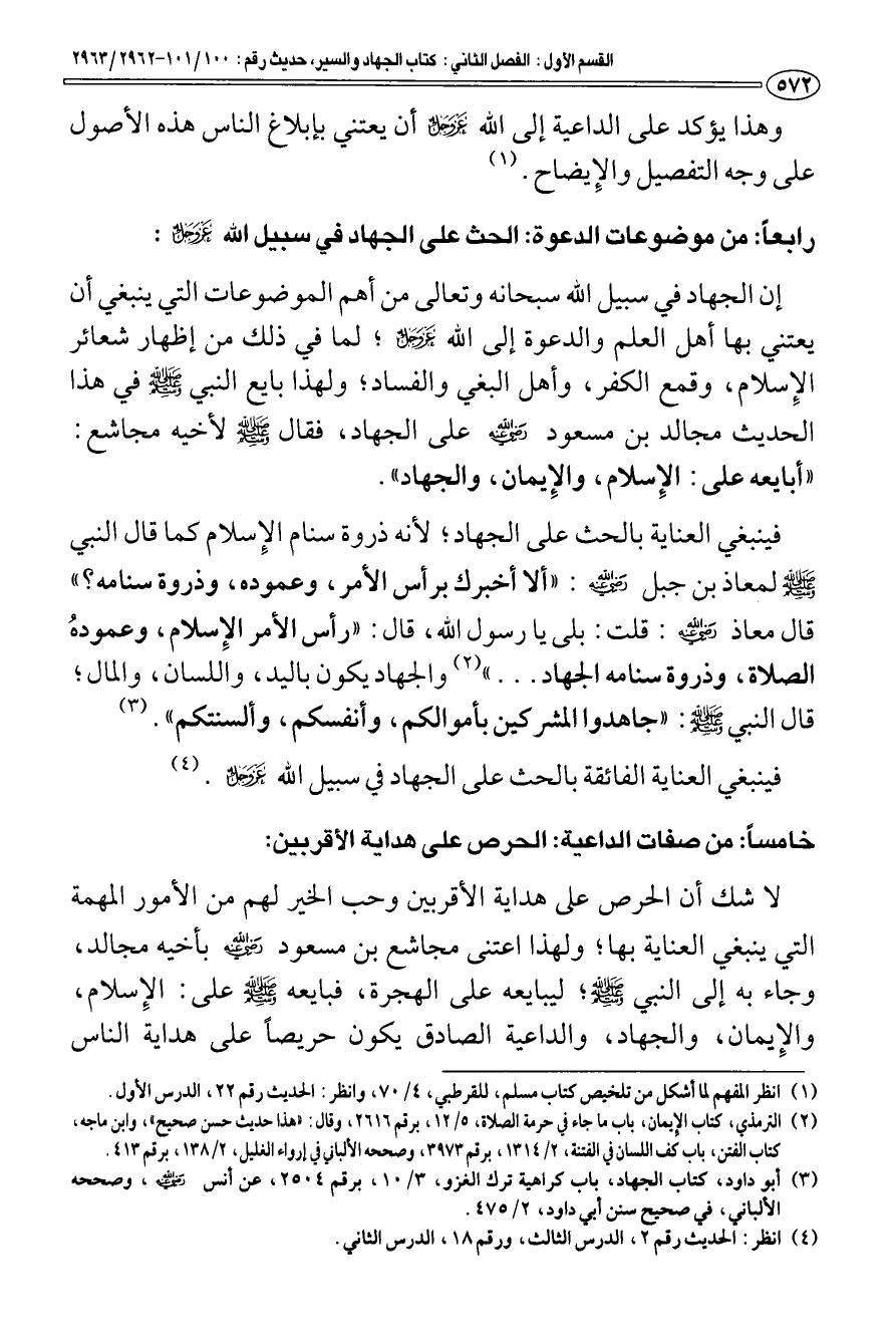 رابعا: من موضوعات الدعوة: الحث على الجهاد في سبيل الله عز وجل: إن الجهاد في سبيل الله سبحانه وتعالى من أهم الموضوعات التي ينبغي أن يعتني بها أهل العلم والدعوة إلى الله عز وجل؛ لما في ذلك من إظهار شعائر الإسلام، وقمع الكفر، وأهل البغي والفساد؛ ولهذا بايع النبي - صلى الله عليه وسلم - في هذا الحديث مجالد بن مسعود - رضي الله عنه - على الجهاد، فقال - صلى الله عليه وسلم - لأخيه مجاشع: «أبايعه على: الإسلام، والإيمان، والجهاد».