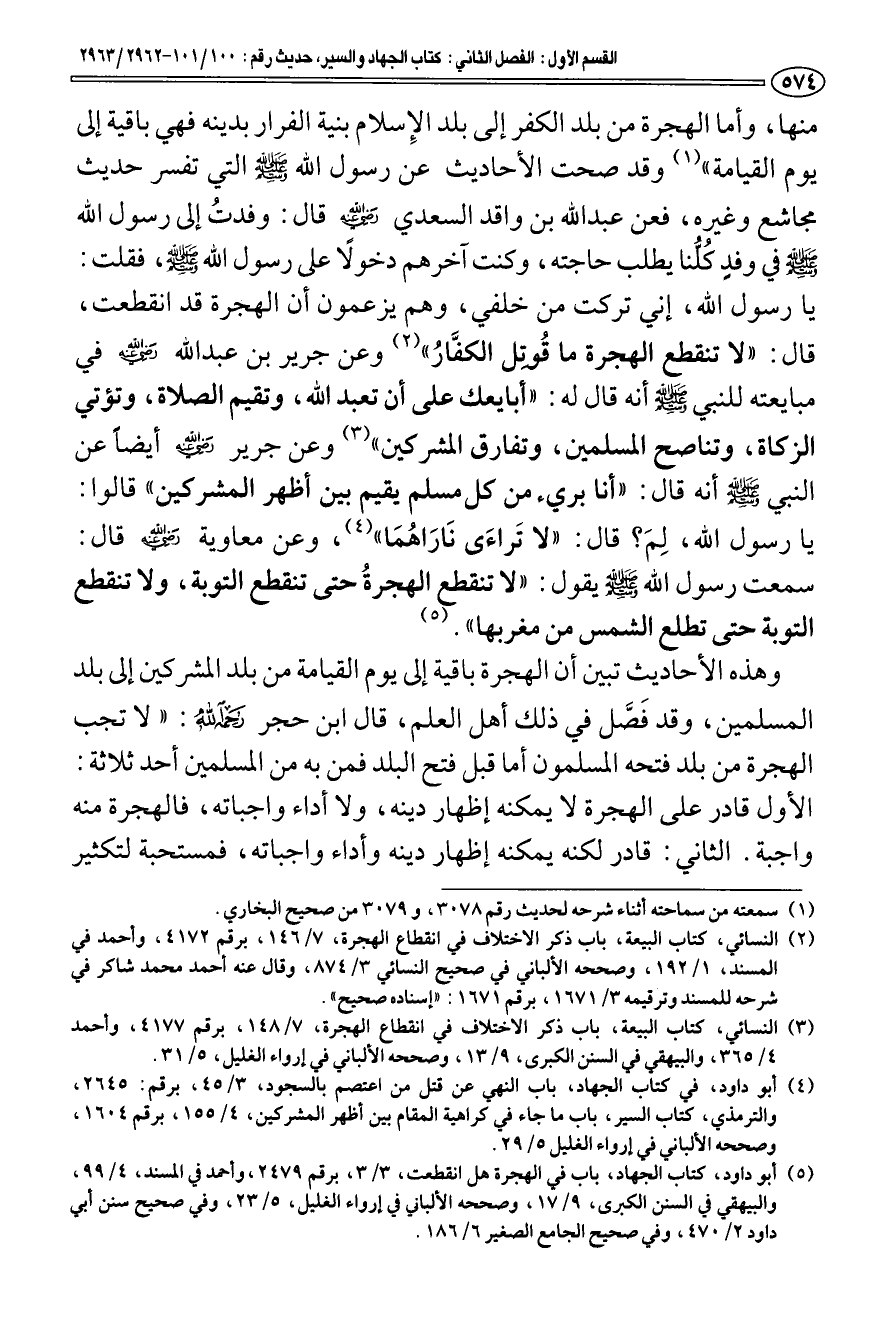 (¬3) النسائي، كتاب البيعة، باب ذكر الاختلاف في انقطاع الهجرة، 7/ 148، برقم 4177، وأحمد 4/ 365، والبيهقي في السنن الكبرى، 9/ 13، وصححه الألباني في إرواء الغليل، 5/ 31.