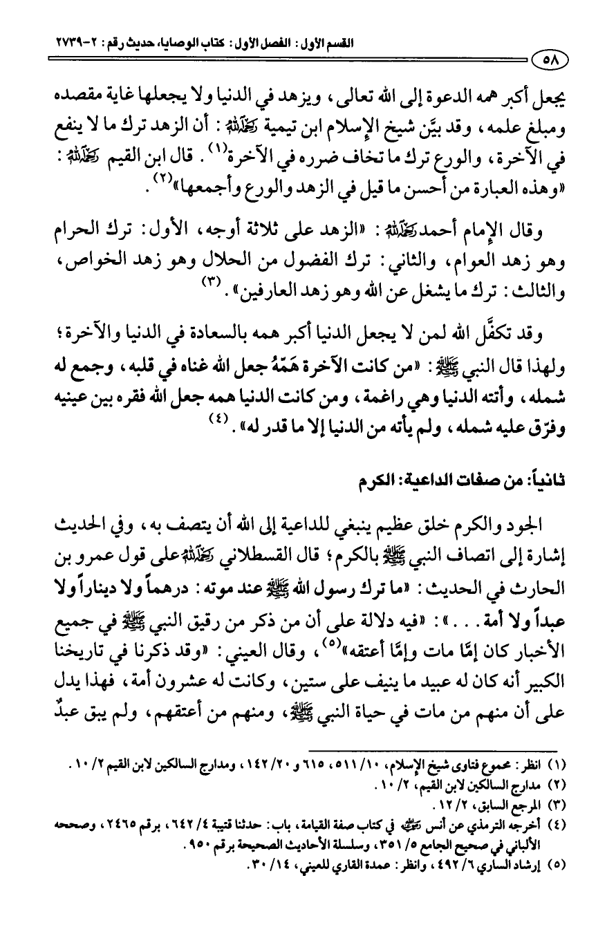 ثانيا: من صفات الداعية: الكرم الجود والكرم خلق عظيم ينبغي للداعية إلى الله أن يتصف به، وفي الحديث إشارة إلى اتصاف النبي صلى الله عليه وسلم بالكرم؛ قال القسطلاني رحمه الله على قول عمرو بن الحارث في الحديث: «ما ترك رسول الله صلى الله عليه وسلم عند موته: درهما ولا دينارا ولا عبدا ولا أمة». . . ": " فيه دلالة على أن من ذكر من رقيق النبي صلى الله عليه وسلم في جميع الأخبار كان إمَّا مات وإمَّا أعتقه " (¬5) وقال العيني: " وقد ذكرنا في تاريخنا الكبير أنه كان له عبيد ما ينيف على ستين، وكانت له عشرون أمة، فهذا يدل على أن منهم من مات في حياة النبي صلى الله عليه وسلم، ومنهم من أعتقهم، ولم يبق عبد