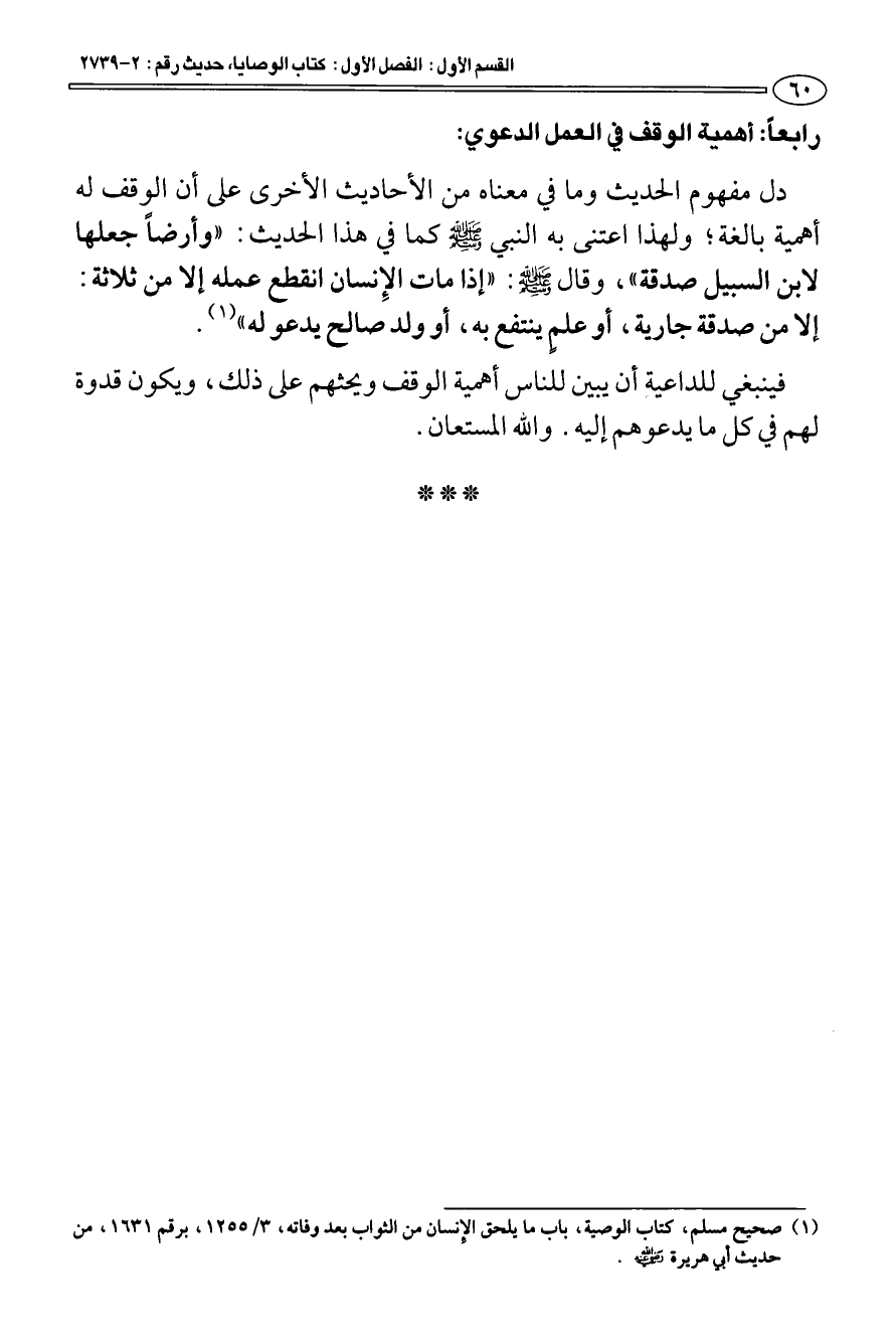 رابعا: أهمية الوقف في العمل الدعوي: دل مفهوم الحديث وما في معناه من الأحاديث الأخرى على أن الوقف له أهمية بالغة؛ ولهذا اعتنى به النبي صلى الله عليه وسلم كما في هذا الحديث: «وأرضا جعلها لابن السبيل صدقة»، وقال صلى الله عليه وسلم: «إذا مات الإِنسان انقطع عمله إلا من ثلاثة: إلا من صدقة جارية، أو علم ينتفع به، أو ولد صالح يدعو له» (¬1).
