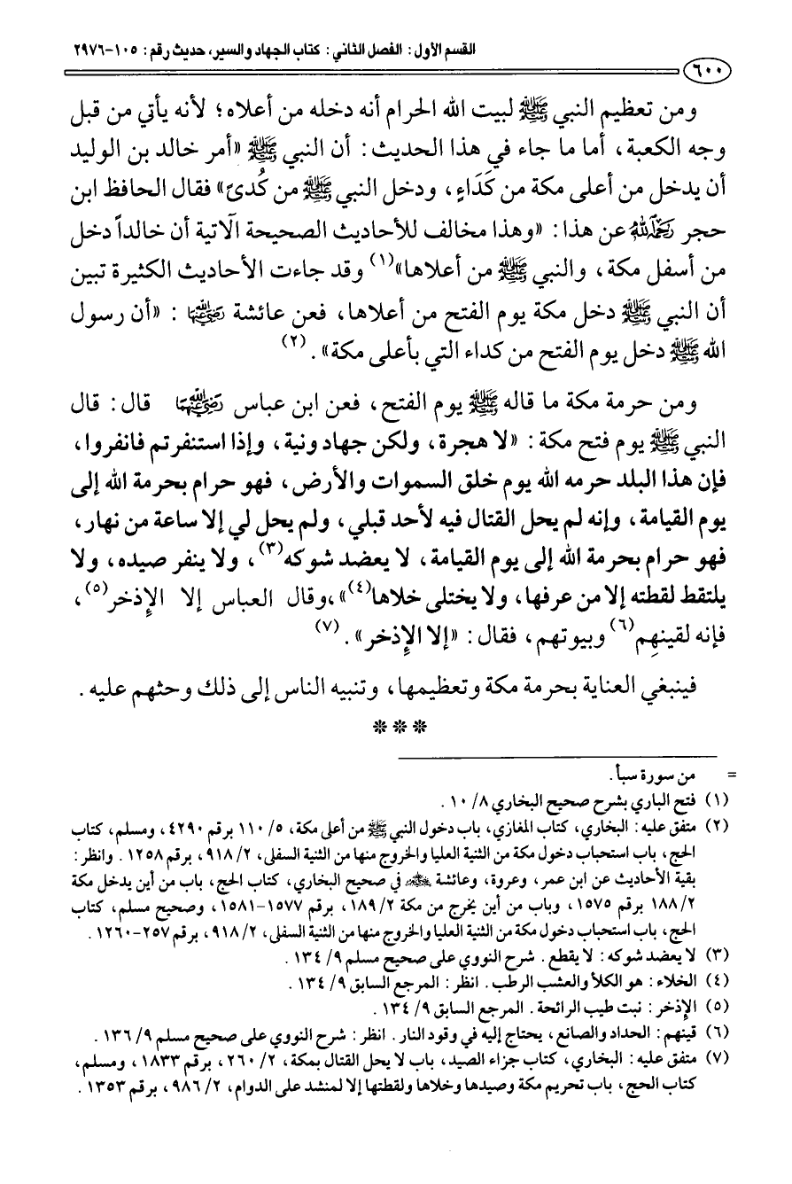 (¬7) متفق عليه: البخاري، كتاب جزاء الصيد، باب لا يحل القتال بمكة، 2/ 260، برقم 1833، ومسلم، كتاب الحج، باب تحريم مكة وصيدها وخلاها ولقطتها إلا لمنشد على الدوام، 2/ 986، برقم 1353.