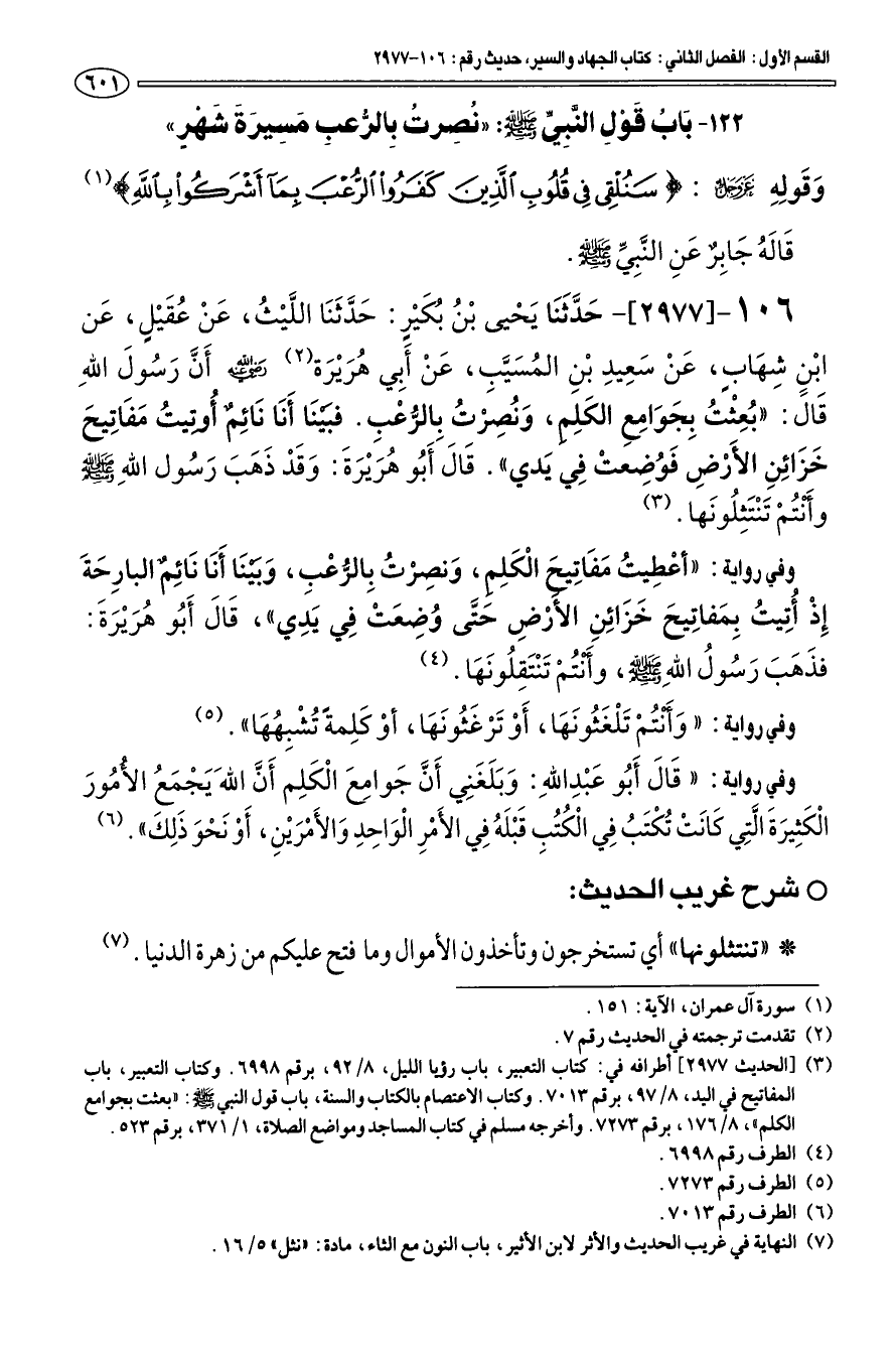 (¬3) [الحديث 2977] أطرافه في: كتاب التعبير، باب رؤيا الليل، 8/ 92، برقم 6998. وكتاب التعبير، باب المفاتيح في اليد، 8/ 97، برقم 7013. وكتاب الاعتصام بالكتاب والسنة، باب قول النبي صلى الله عليه وسلم: " بعثت بجوامع الكلم "، 8/ 176، برقم 7273. وأخرجه مسلم في كتاب المساجد ومواضع الصلاة، 1/ 371، برقم 523.