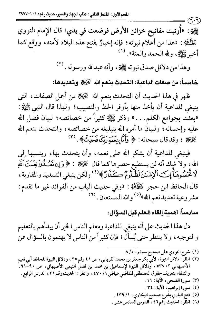 خامسا: من صفات الداعية: التحدث بنعم الله عز وجل وتعديدها: ظهر في هذا الحديث أن التحدث بنعم الله عز وجل من أجمل الصفات، التي ينبغي للداعية أن يأخذ منها بأوفر الحظ والنصيب؛ ولهذا قال النبي صلى الله عليه وسلم: «بعثت بجوامع الكلم». . . " وذكر صلى الله عليه وسلم كثيرا من خصائصه؛ لبيان فضل الله عليه وإحسانه؛ ولبيان ما أمره الله بتبليغه من خصائصه، والتحدث بنعم الله عز وجل، وقد قال سبحانه: {وَأَمَّا بِنِعْمَةِ رَبِّكَ فَحَدِّثْ} [الضحى: 11] (¬3).
