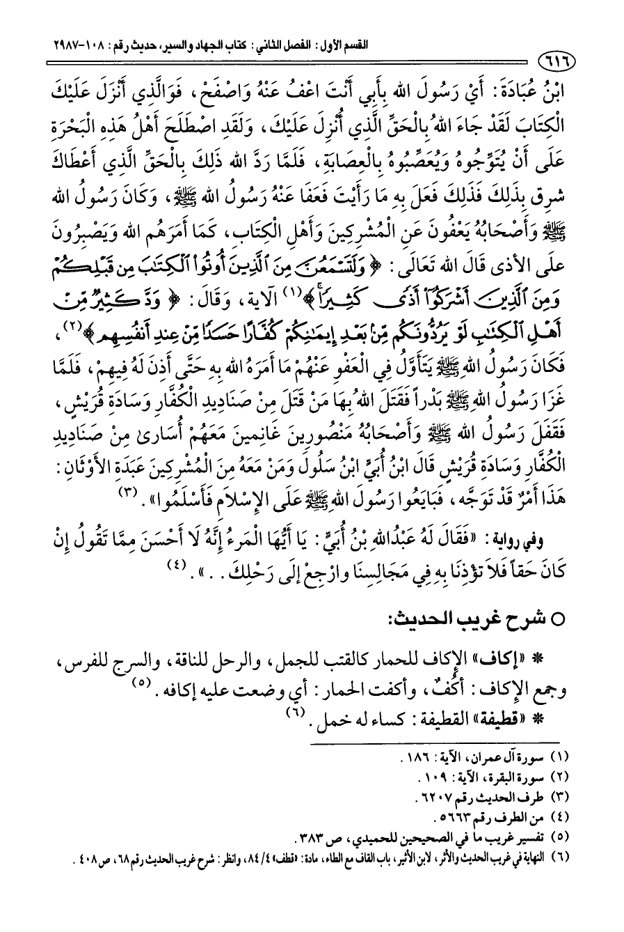 ابْن عبَادَةَ: أَيْ رَسولَ الله بِأَبِي أنتَ اعْف عَنْه وَاصْفَحْ، فَوَالَّذِي أنزَلَ عَلَيْكَ الْكِتَابَ لَقَدْ جَاءَ الله بِالْحَقِّ الَّذِي أنزِلَ عَلَيكَ، وَلَقَدِ اصْطَلَحَ أَهْل هَذِهِ الْبَحْرَةِ عَلَى أَنْ يتَوِّجوه وَيعصبوه بِالْعِصَابَة، فَلَمَّا رَدَّ الله ذَلِكَ بِالْحَقِّ الَّذِي أَعْطَاكَ شرِق بذَلِكَ فَذَلِكَ فَعَلَ بِهِ مَا رَأَيْتَ فَعَفَا عَنْه رَسول الله صلى الله عليه وسلم، وَكَانَ رَسول الله صلى الله عليه وسلم وَأصْحَابه يَعْفونَ عَنِ الْمشْرِكِينَ وَأَهْلِ الْكِتَابِ، كَمَا أَمَرَهم الله وَيَصْبِرونَ علَى الأذى قَالَ الله تَعَالَى: {وَلَتَسْمَعُنَّ مِنَ الَّذِينَ أُوتُوا الْكِتَابَ مِنْ قَبْلِكُمْ وَمِنَ الَّذِينَ أَشْرَكُوا أَذًى كَثِيرًا} [آل عمران: 186] (¬1) الآية، وَقَالَ: {وَدَّ كَثِيرٌ مِنْ أَهْلِ الْكِتَابِ لَوْ يَرُدُّونَكُمْ مِنْ بَعْدِ إِيمَانِكُمْ كُفَّارًا حَسَدًا مِنْ عِنْدِ أَنْفُسِهِمْ} [البقرة: 109] (¬2) فَكَانَ رَسول اللهِ صلى الله عليه وسلم يَتَأَوَّل فِي الْعَفْوِ عَنْهمْ مَا أَمَرَه الله بِهِ حَتَّى أَذِنَ لَه فِيهِمْ، فَلَمَّا غَزَا رَسول اللهِ صلى الله عليه وسلم بَدْرا فَقَتَلَ الله بِهَا مَنْ قَتَلَ مِنْ صَنَادِيدِ الْكفَّارِ وَسَادَةِ قرَيْشٍ، فَقَفَلَ رَسول الله صلى الله عليه وسلم وَأَصْحَابه مَنْصورِينَ غَانِمينَ مَعَهمْ أسَارى مِنْ صَنَادِيدِ الْكفَّارِ وَسَادَةِ قرَيْشٍ قَالَ ابْن أبَيٍّ ابْن سَلولَ وَمَنْ مَعَه مِنَ الْمشْرِكِينَ عَبَدَة الأَوْثَانِ: هَذَا أَمْر قَدْ تَوَجَّه، فَبَايَعوا رَسولَ اللهِ صلى الله عليه وسلم عَلَى الإِسْلاَمِ فَأَسْلَموا» (¬3).