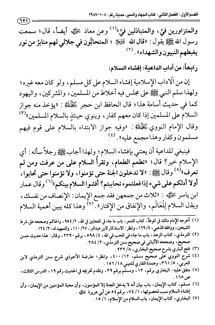 (¬6) مسلم، كتاب الإِيمان، باب بيان أنه لا يدخل الجنة إلا المؤمنون، وأن محبة المؤمنين من الإِيمان، وأن إفشاء السلام سبب لحصولها، 1/ 74، برقم 54 عن أبي هريرة رضي الله عنه.