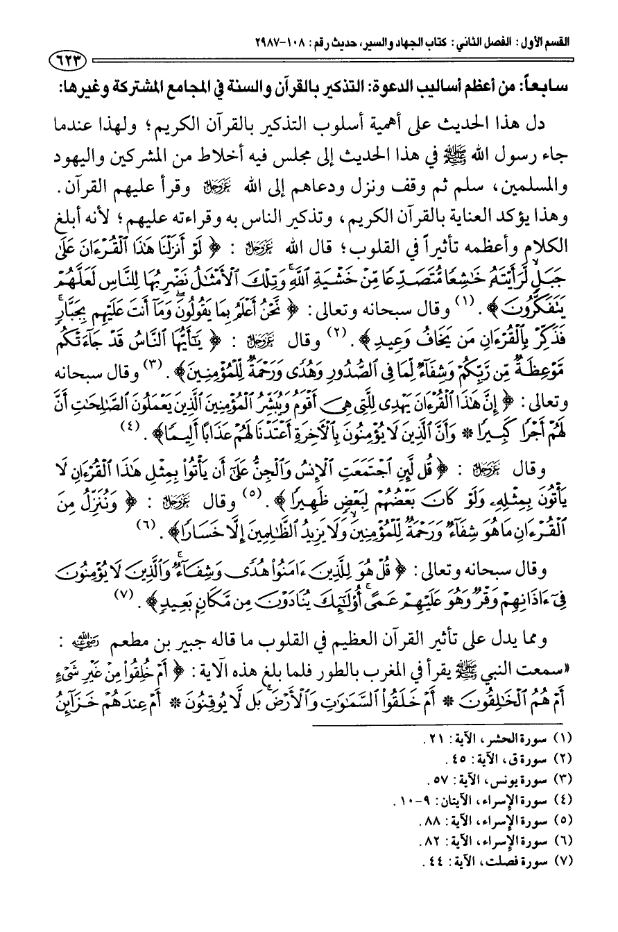 سابعا: من أعظم أساليب الدعوة: التذكير بالقرآن والسنة في المجامع المشتركة وغيرها: دل هذا الحديث على أهمية أسلوب التذكير بالقرآن الكريم؛ ولهذا عندما جاء رسول الله صلى الله عليه وسلم في هذا الحديث إلى مجلس فيه أخلاط من المشركين واليهود والمسلمين، سلم ثم وقف ونزل ودعاهم إلى الله عز وجل وقرأ عليهم القرآن. وهذا يؤكد العناية بالقرآن الكريم، وتذكير الناس به وقراءته عليهم؛ لأنه أبلغ الكلام وأعظمه تأثيرا في القلوب؛ قال الله عز وجل: {لَوْ أَنْزَلْنَا هَذَا الْقُرْآنَ عَلَى جَبَلٍ لَرَأَيْتَهُ خَاشِعًا مُتَصَدِّعًا مِنْ خَشْيَةِ اللَّهِ وَتِلْكَ الْأَمْثَالُ نَضْرِبُهَا لِلنَّاسِ لَعَلَّهُمْ يَتَفَكَّرُونَ} [الحشر: 21] (¬1) وقال سبحانه وتعالى: {نَحْنُ أَعْلَمُ بِمَا يَقُولُونَ وَمَا أَنْتَ عَلَيْهِمْ بِجَبَّارٍ فَذَكِّرْ بِالْقُرْآنِ مَنْ يَخَافُ وَعِيدِ} [ق: 45] (¬2) وقال عز وجل: {يَا أَيُّهَا النَّاسُ قَدْ جَاءَتْكُمْ مَوْعِظَةٌ مِنْ رَبِّكُمْ وَشِفَاءٌ لِمَا فِي الصُّدُورِ وَهُدًى وَرَحْمَةٌ لِلْمُؤْمِنِينَ} [يونس: 57] (¬3) وقال سبحانه وتعالى: {إِنَّ هَذَا الْقُرْآنَ يَهْدِي لِلَّتِي هِيَ أَقْوَمُ وَيُبَشِّرُ الْمُؤْمِنِينَ الَّذِينَ يَعْمَلُونَ الصَّالِحَاتِ أَنَّ لَهُمْ أَجْرًا كَبِيرًا - وَأَنَّ الَّذِينَ لَا يُؤْمِنُونَ بِالْآخِرَةِ أَعْتَدْنَا لَهُمْ عَذَابًا أَلِيمًا} [الإسراء: 9 - 10] (¬4).