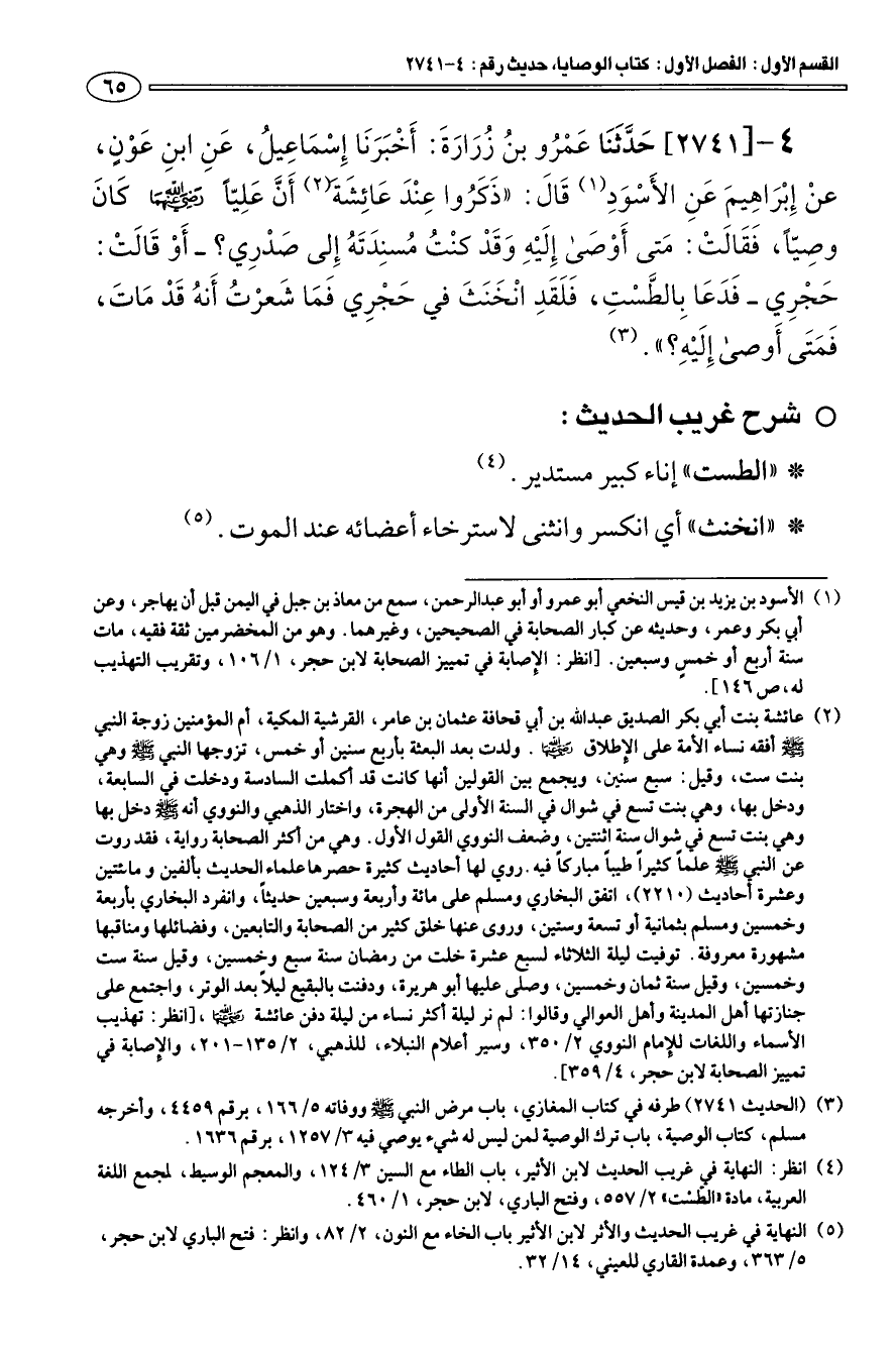 4 - [2741] حَدَّثَنَا عَمْرو بن زرَارَةَ: أَخْبَرَنَا إِسْمَاعِيل، عَنِ ابنِ عَوْنٍ، عنْ إِبْرَاهِيمَ عَنِ الأَسْوَدِ (¬1) قَالَ: " ذَكَرورا عِنْدَ عَائِشة (¬2) أَنَّ عَلِيّا رضي الله عنهما كَانَ وصيّا، فَقَالَتْ: مَتى أَوْصى إِلَيْهِ وَقَدْ كنْت مسنِدَتَه إِلى صَدْرِي؟ - أَوْ قَالَتْ: حَجْرِي- فَدَعَا بِالطَّسْتِ، فَلَقَدِ انْخَنَثَ في حَجْرِي فَمَا شَعرْت أَنه قَدْ مَاتَ، فمتَى أَوصى إِلَيْهِ؟ " (¬3).