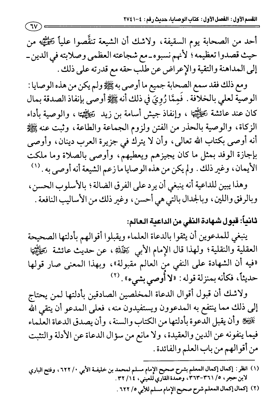 ثانيا: قبول شهادة النفي من الداعية العالم: ينبغي للمدعوين أن يثقوا بالدعاة العلماء ويقبلوا أقوالهم بأدلتها الصحيحة العقلية والنقلية؛ ولهذا قال الإمام الأبي رحمه الله، عن حديث عائشة رضي الله عنها " فيه أن الشهادة على النفي من العالم مقبولة "، وبهذا المعنى صار قولها حديثا، فكأنه بمنزلة قوله: " لا أوصي بشيء " (¬2).