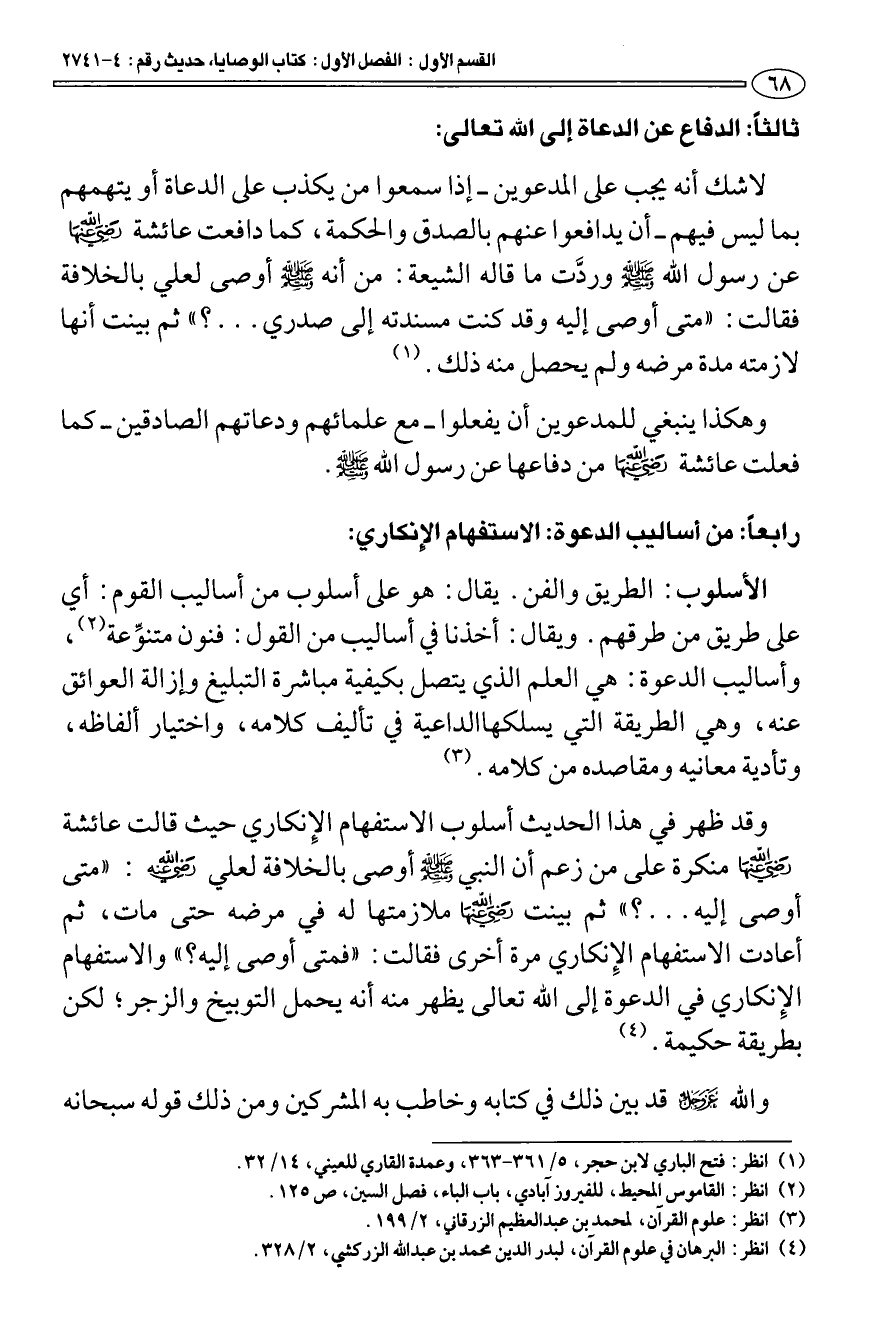 ثالثا: الدفاع عن الدعاة إلى الله تعالى: لا شك أنه يجب على المدعوين- إذا سمعوا من يكذب على الدعاة أو يتهمهم بما ليس فيهم- أن يدافعوا عنهم بالصدق والحكمة، كما دافعت عائشة رضي الله عنها عن رسول الله صلى الله عليه وسلم وردَّت ما قاله الشيعة: من أنه صلى الله عليه وسلم أوصى لعلي بالخلافة فقالت: " متى أوصى إليه وقد كنت مسندته إلى صدري. . .؟ " ثم بينت أنها لازمته مدة مرضه ولم يحصل منه ذلك (¬1).