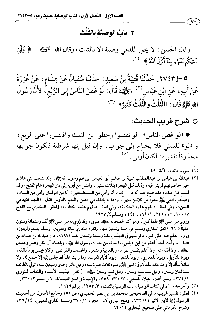 5 - [2743] حَدَّثَنَا قتيبَة بن سَعيدٍ: حَدَّثَنَا سفيان عَن هِشَامٍ، عَنْ عرْوَةَ عَنْ أَبِيهِ، عَنِ ابنِ عَبَّاسٍ (¬2) رضي الله عنهما قَالَ: لَوْ غَضَّ النَّاس إِلى الرّبْعِ، لأَنَّ رَسولَ اللهِ صلى الله عليه وسلم قالَ: «الثلث والثّلث كَثيرٌ» (¬3).